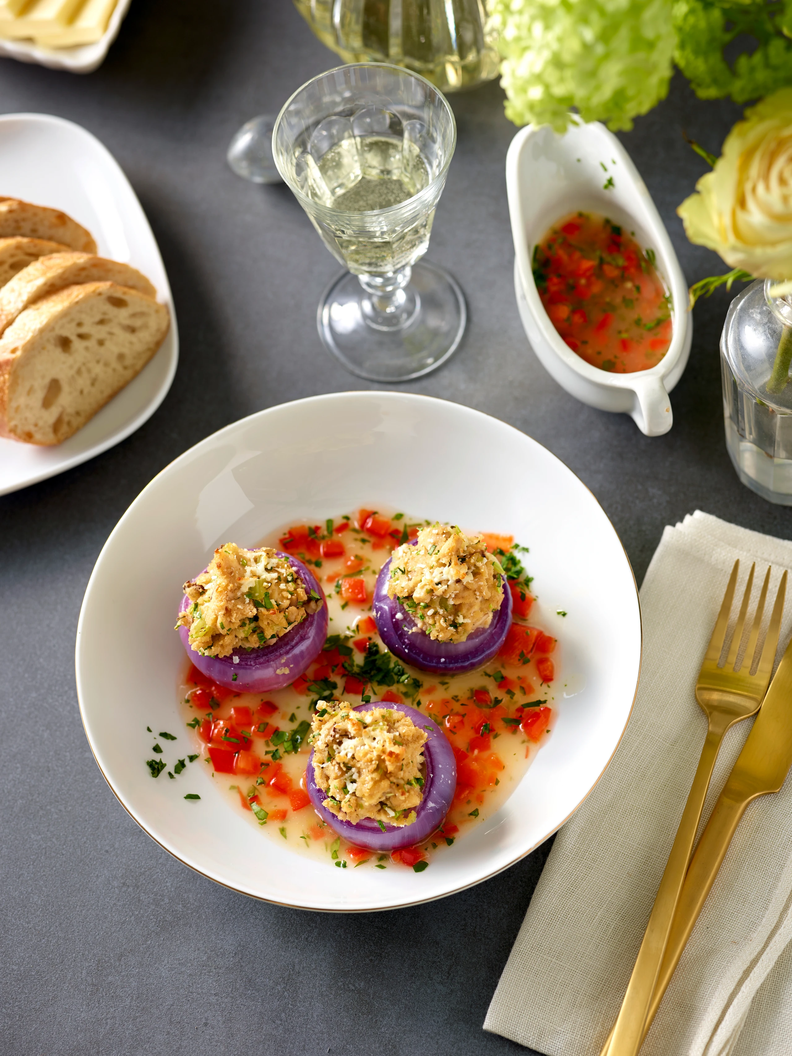 Rote Zwiebeln mit Hendl-Couscousfülle und Feta