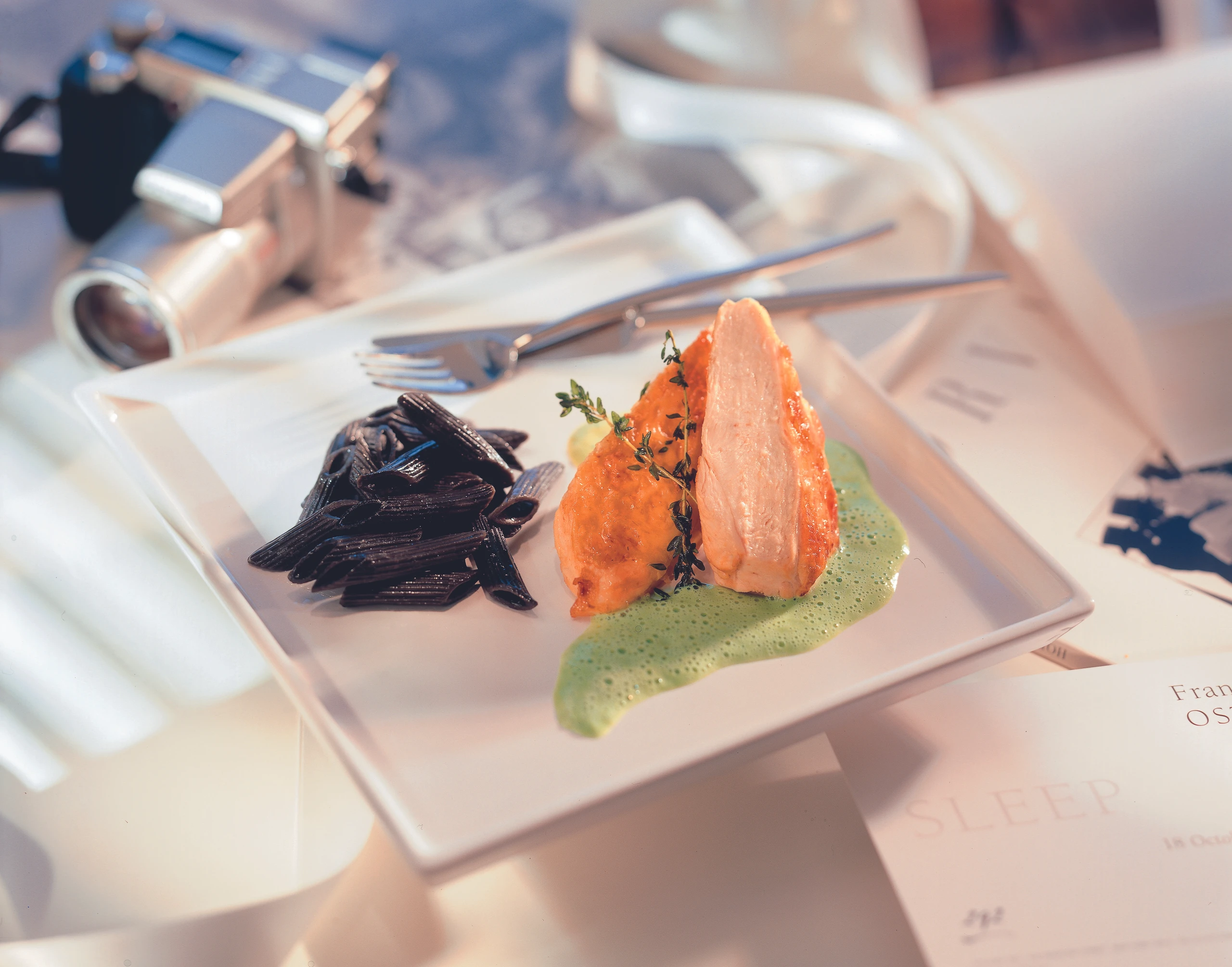 Hühnerfilets mit schwarzen Nudeln und Erbsensauce