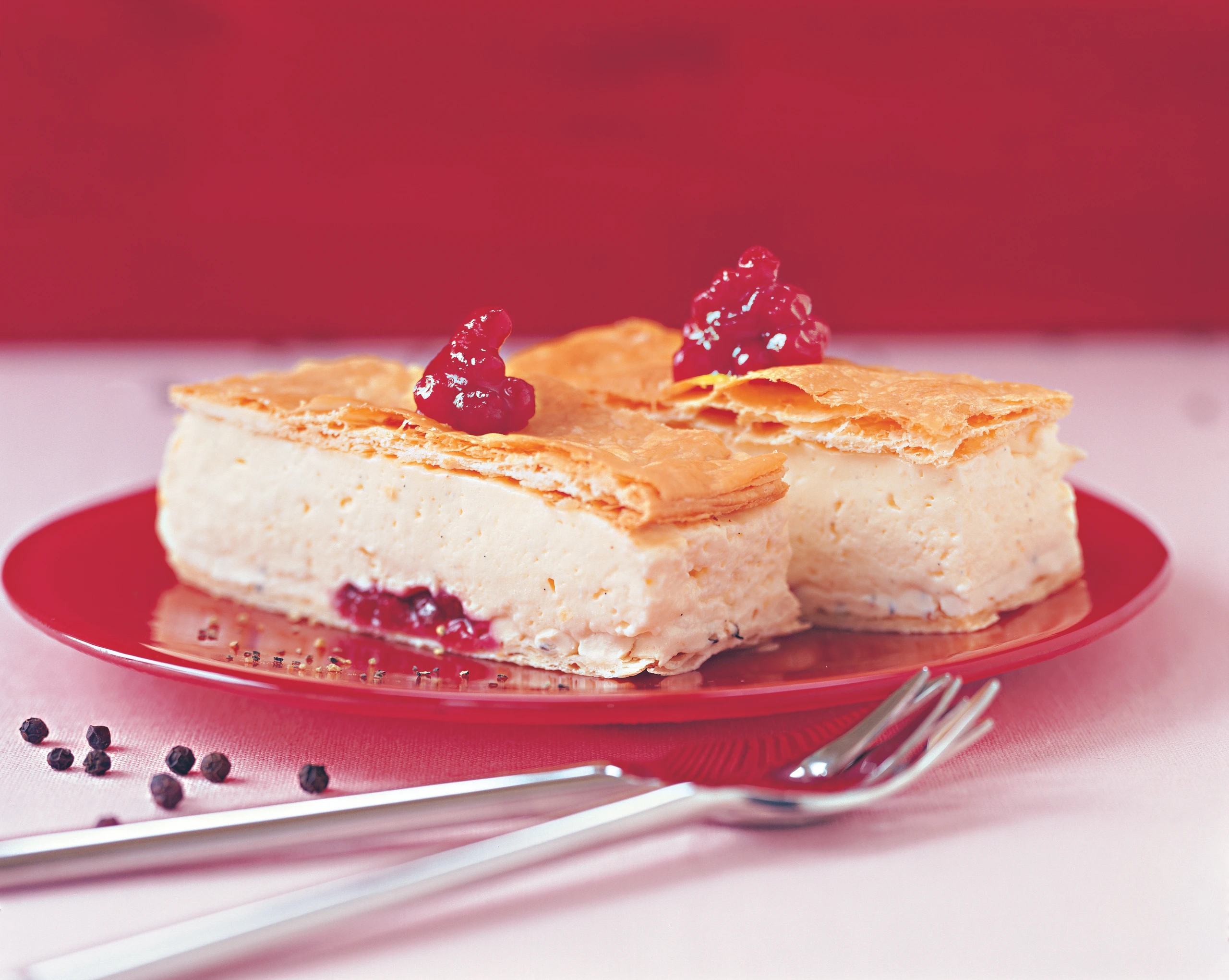 Cremeschnitte mit Vanille-Preiselbeer-Pfeffercreme
