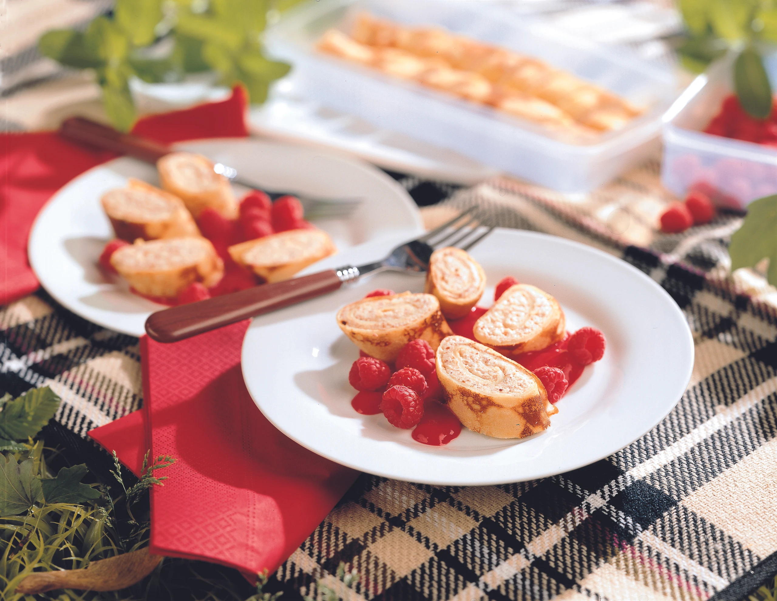 Topfen-Palatschinken-Roulade mit Himbeersauce