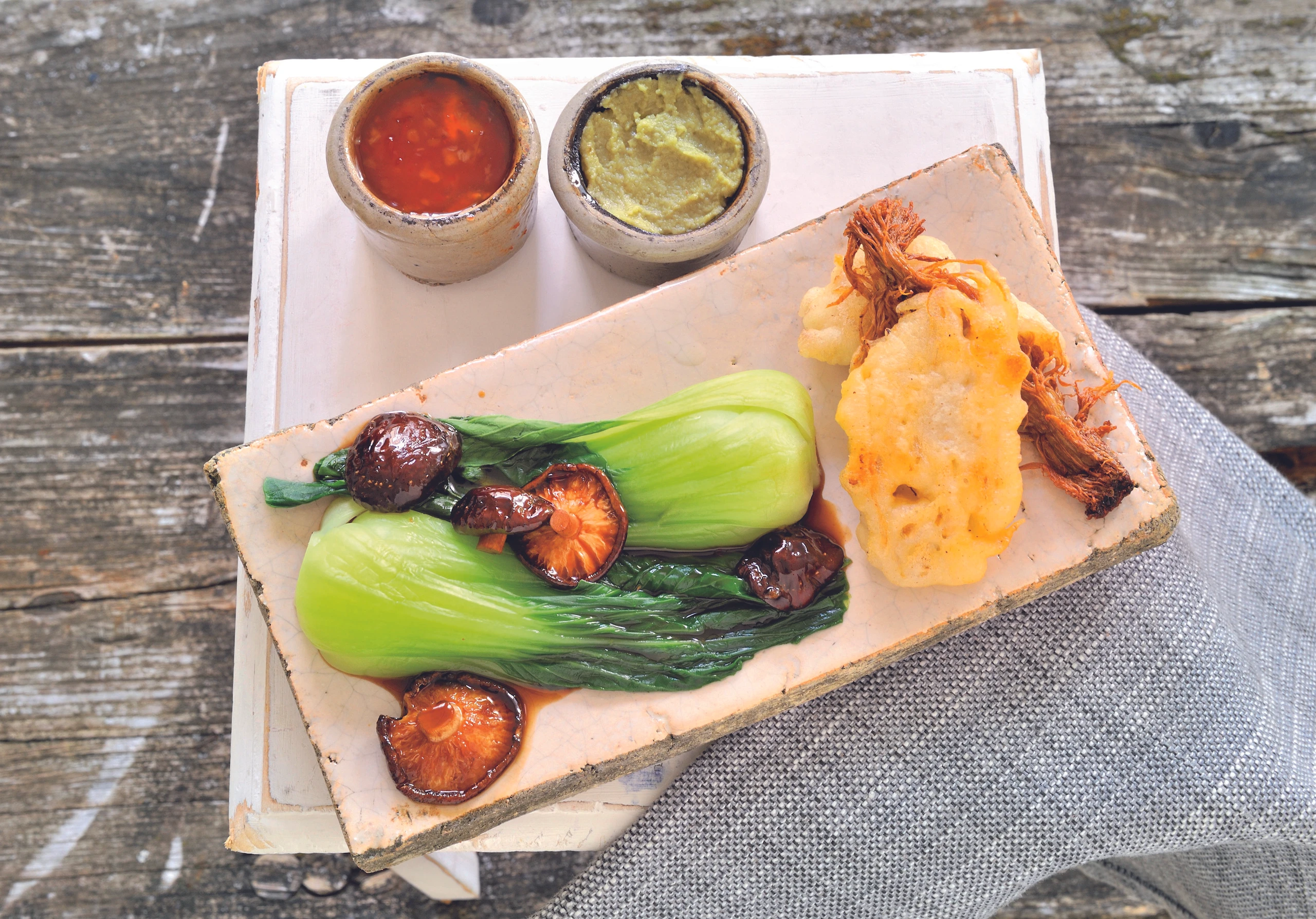 Geschmorte Shiitake mit Pak Choi und Enoki-Tempura