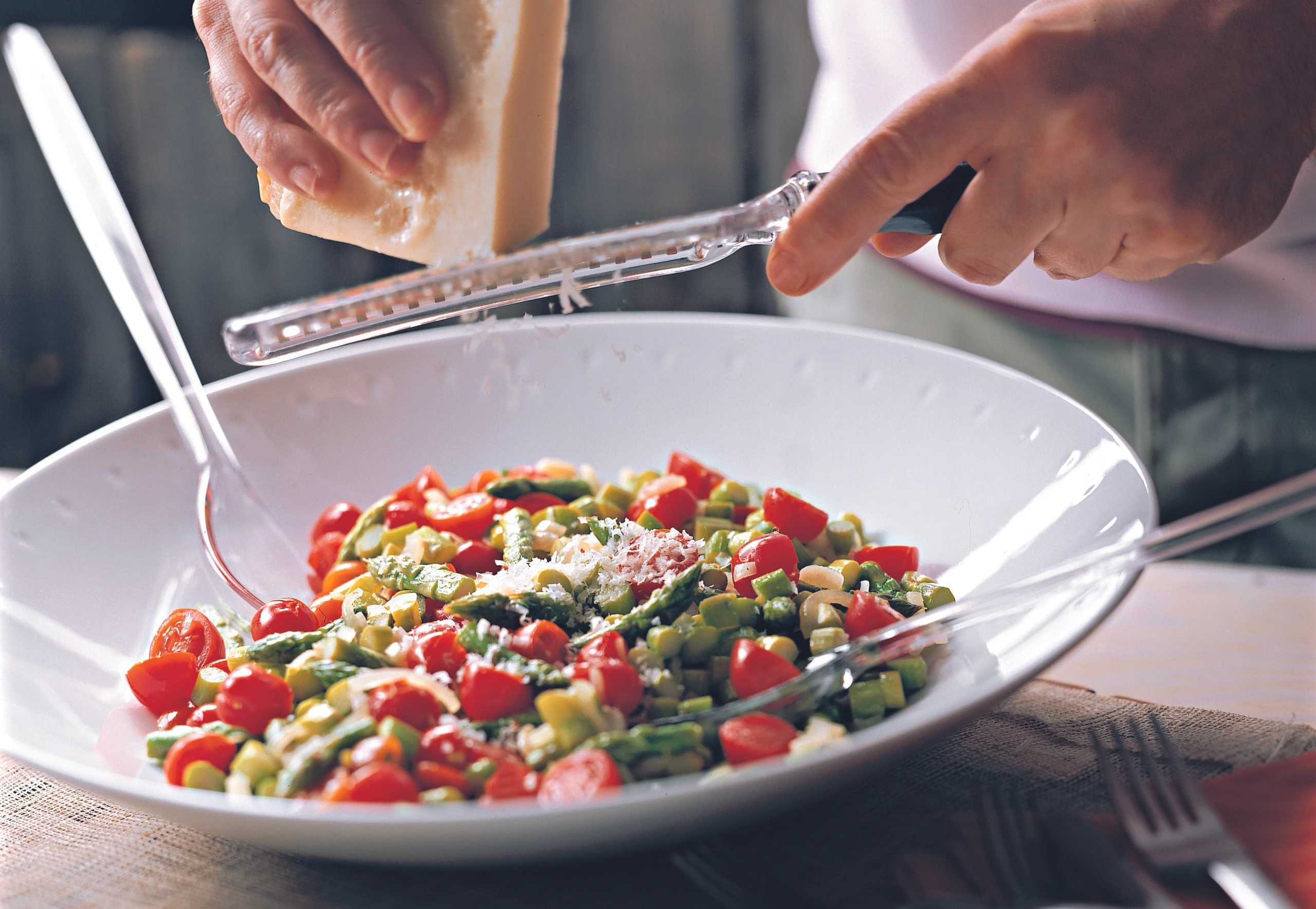 Zwiebel und Knoblauch schälen, klein schneiden und im Öl anrösten. Spargel und Tomaten mitrösten, salzen, pfeffern und mit Wein ablöschen. Zugedeckt ca. 5 Minuten dünsten. Mit Parmesan bestreut servieren.