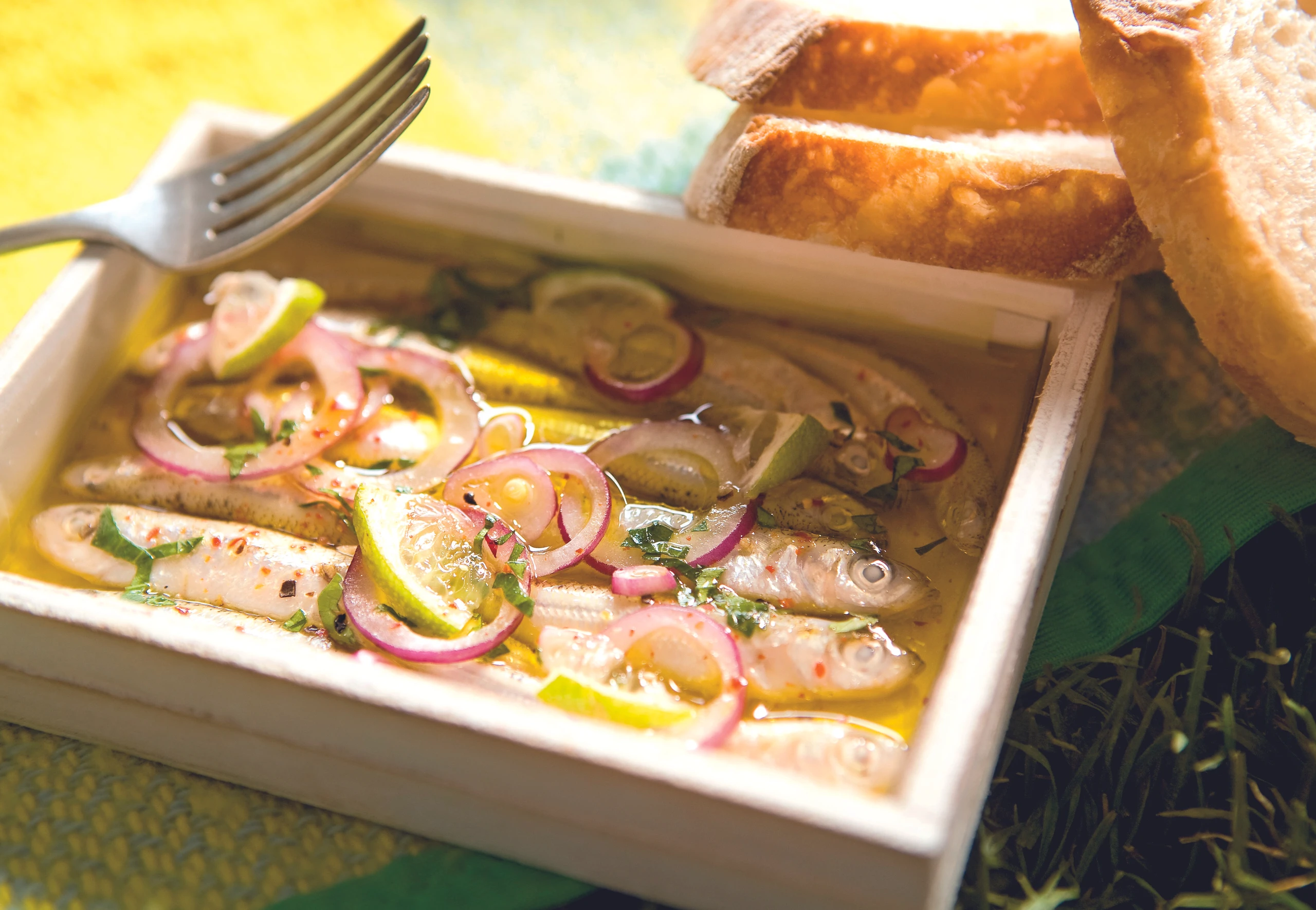 Zitrone und Limette in kleine Stücke schneiden und zugeben. Mit Salz und Pfeffer kräftig würzen. Olivenöl zugeben, Fische mindestens 30 Minuten ziehen lassen. Petersilie fein schneiden und zugeben. Fische in ein gut verschließbares Gefäß geben. Dazu passt Weißbrot.