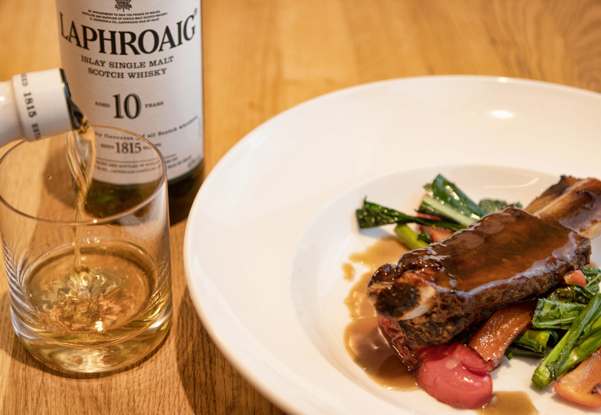 Abdrehen und beiseite stellen bis die Rippchen fertig sind. Die fertigen Rippchen im Rohr bei 100 °C warm stellen. Glace erhitzen mit gut 1-2 cl Laphroaig Single Malt abschmecken.