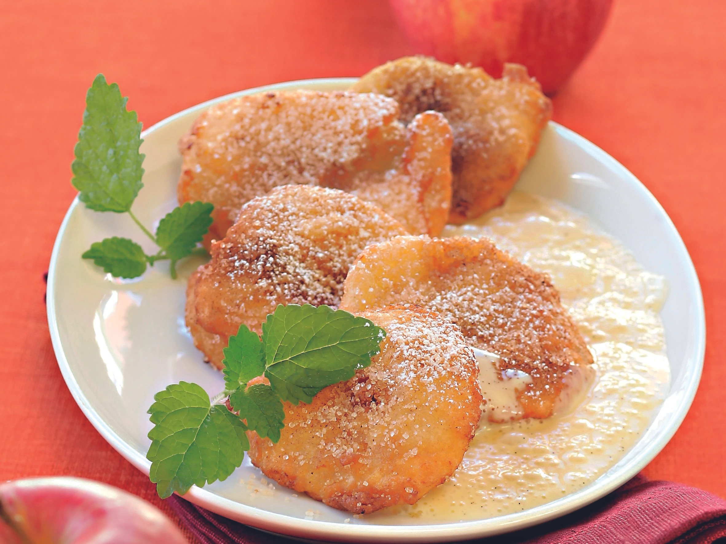 - Butterschmalz erhitzen. Äpfel durch den Teig ziehen und darin backen. Abtropfen lassen, mit Zimt und Streuzucker bestreuen. Dazu passt Rama Cremefine Vanilla.