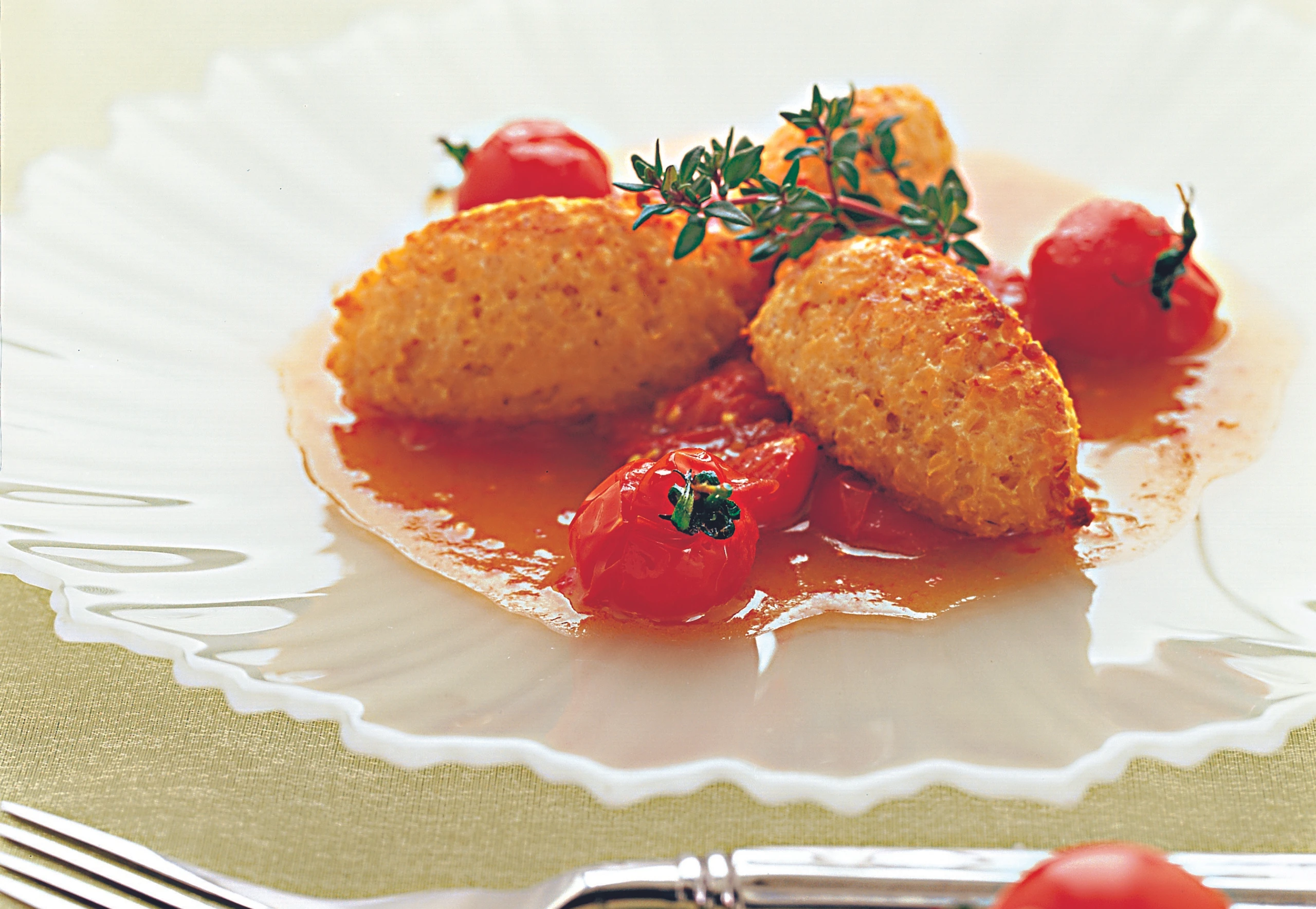 Überbackene Bulgur-Nockerl mit geschmorten Paradeisern