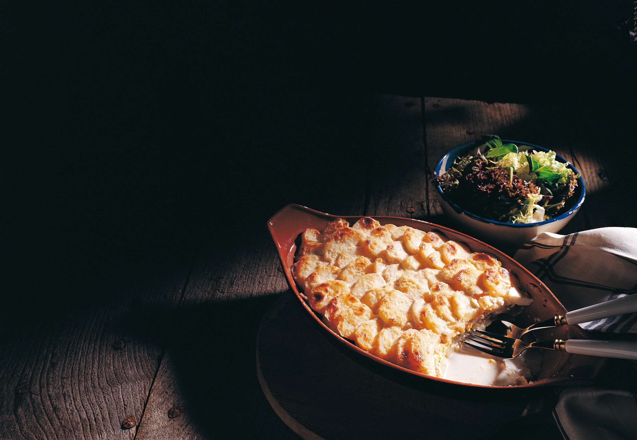 Gratin: Überbackene Erdäpfel mit Gurkerln und hartgekochten Eiern