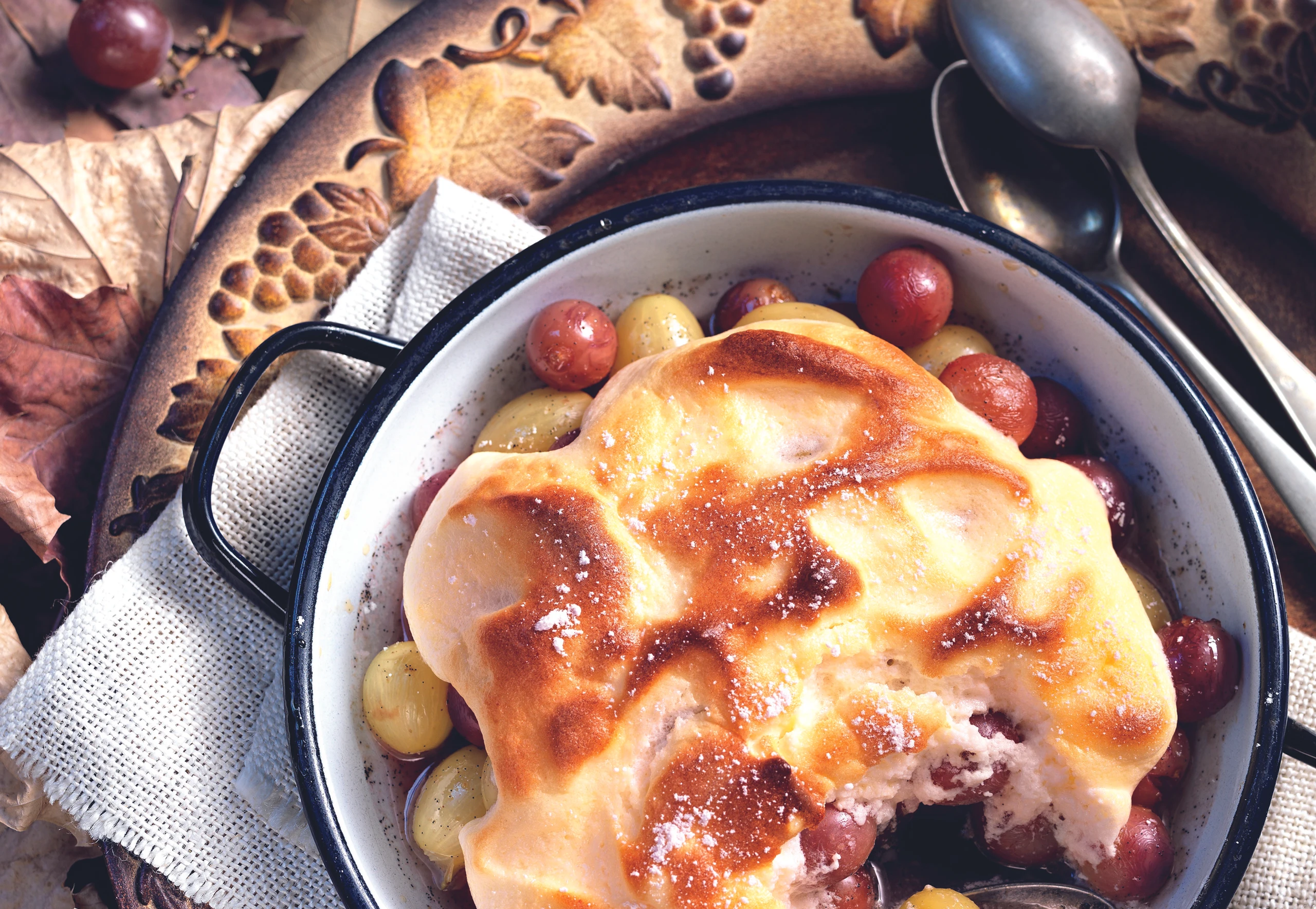 Topfenmasse auf den Trauben verteilen und im Rohr (mittlere Schiene / Gitterrost) am besten in 2 Arbeitsgängen goldbraun überbacken (dauert pro Durchgang ca. 8 Minuten). Aus dem Rohr nehmen und rasch servieren.