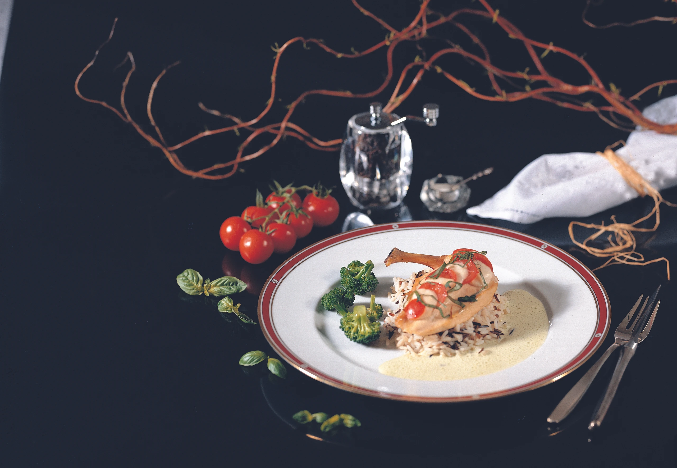Hühnerfilets aus dem Rohr nehmen, mit restlichem Basilikum bestreuen und mit der Sauce anrichten. Als Beilagen serviert man Reis und Brokkoligemüse.