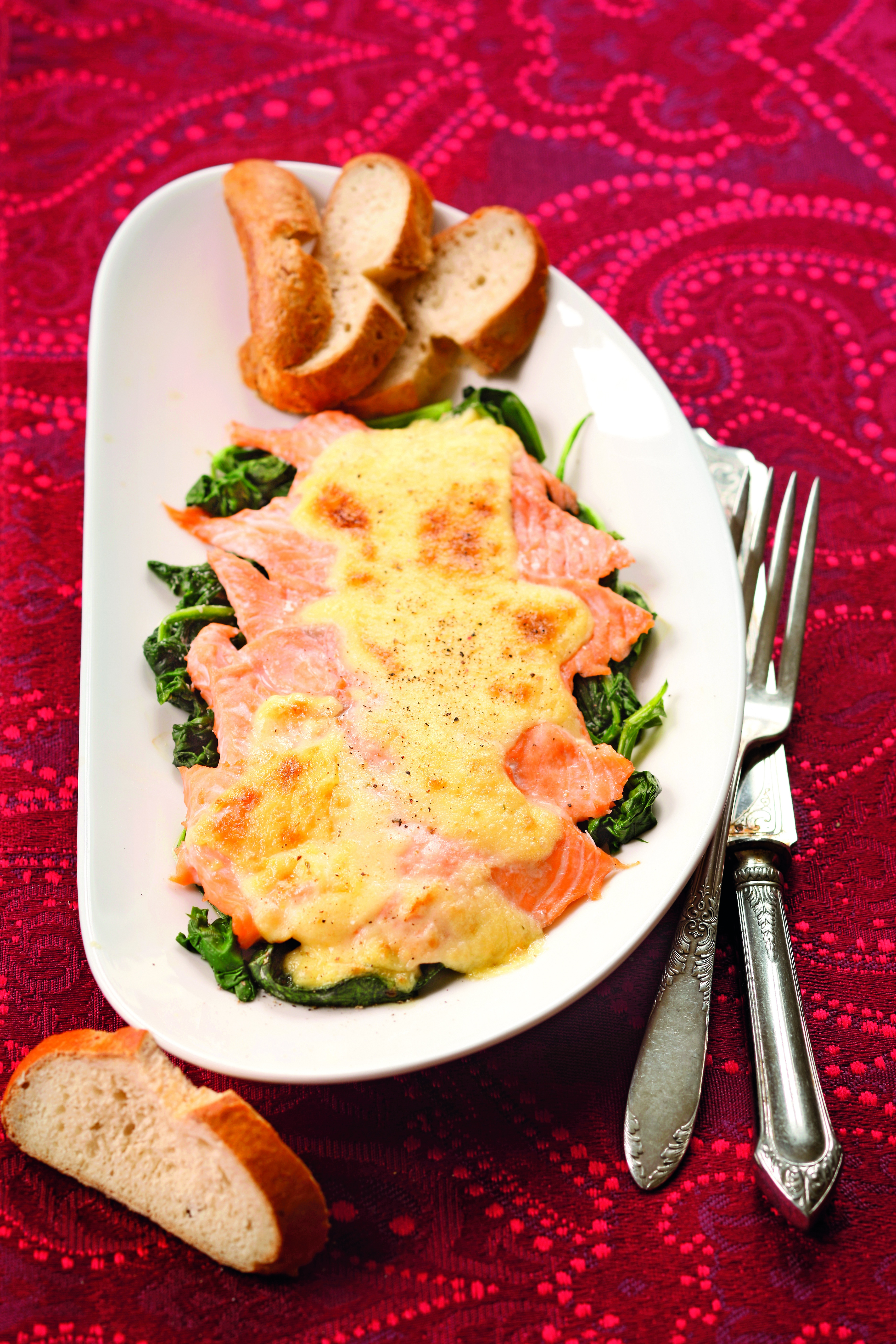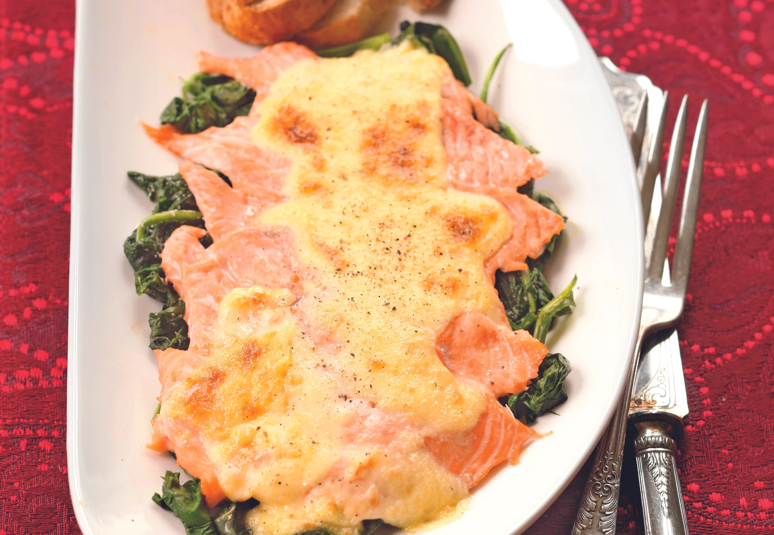 Spinat tropfnass in einen Topf geben, zudecken und bei mittlerer Hitze zusammenfallen lassen, salzen und pfeffern. Spinat auf hitzebeständigen Tellern verteilen, Lachsforelle kreisförmig darauflegen, salzen und pfeffern.
