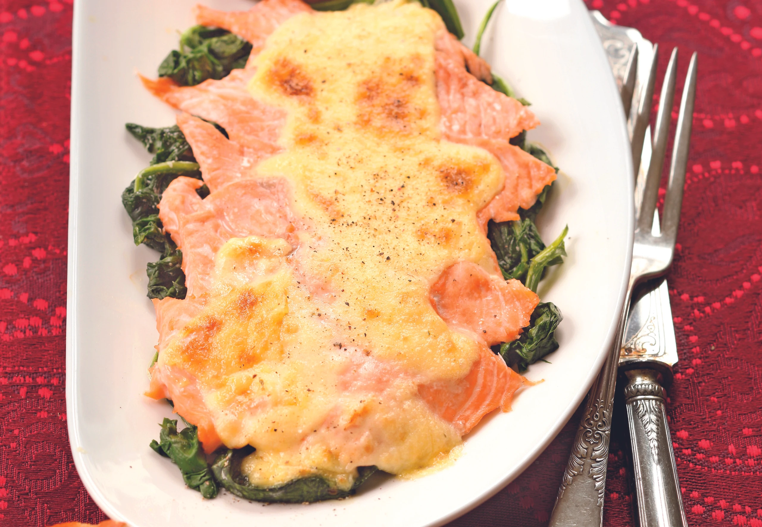 - Spinat tropfnass in einen Topf geben, zudecken und bei mittlerer Hitze zusammenfallen lassen, salzen und pfeffern. Spinat auf hitzebeständigen Tellern verteilen, Lachsforelle kreisförmig darauflegen, salzen und pfeffern.