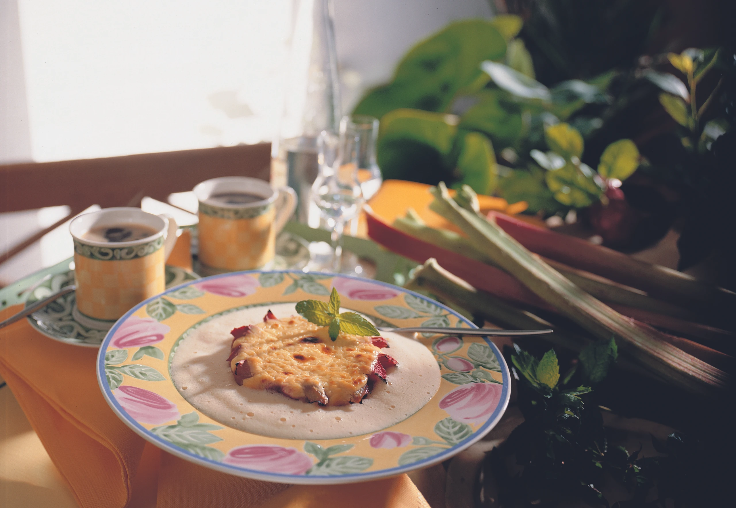 - 3 Dotter mit 2 EL Kristallzucker, 2 EL Himbeerbrand, 7 EL Rharbarbersaft (Kochfond) und 1 EL Zitronensaft in einem Schneekessel vermischen und über Wasserdampf dickcremig aufschlagen. Sabayon sofort servieren.