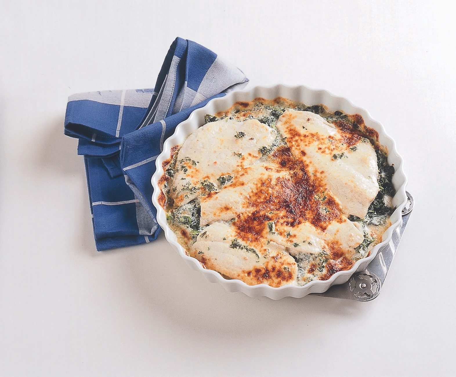 - Butter zerlassen, Zwutschgerl einlegen und mit Salz und Pfeffer würzen. 60 ml Wasser zugießen, den Spinat unter Rühren erhitzen und in der Form gleichmäßig verteilen. Mit den Fischfilets belegen. Fisch salzen und pfeffern.