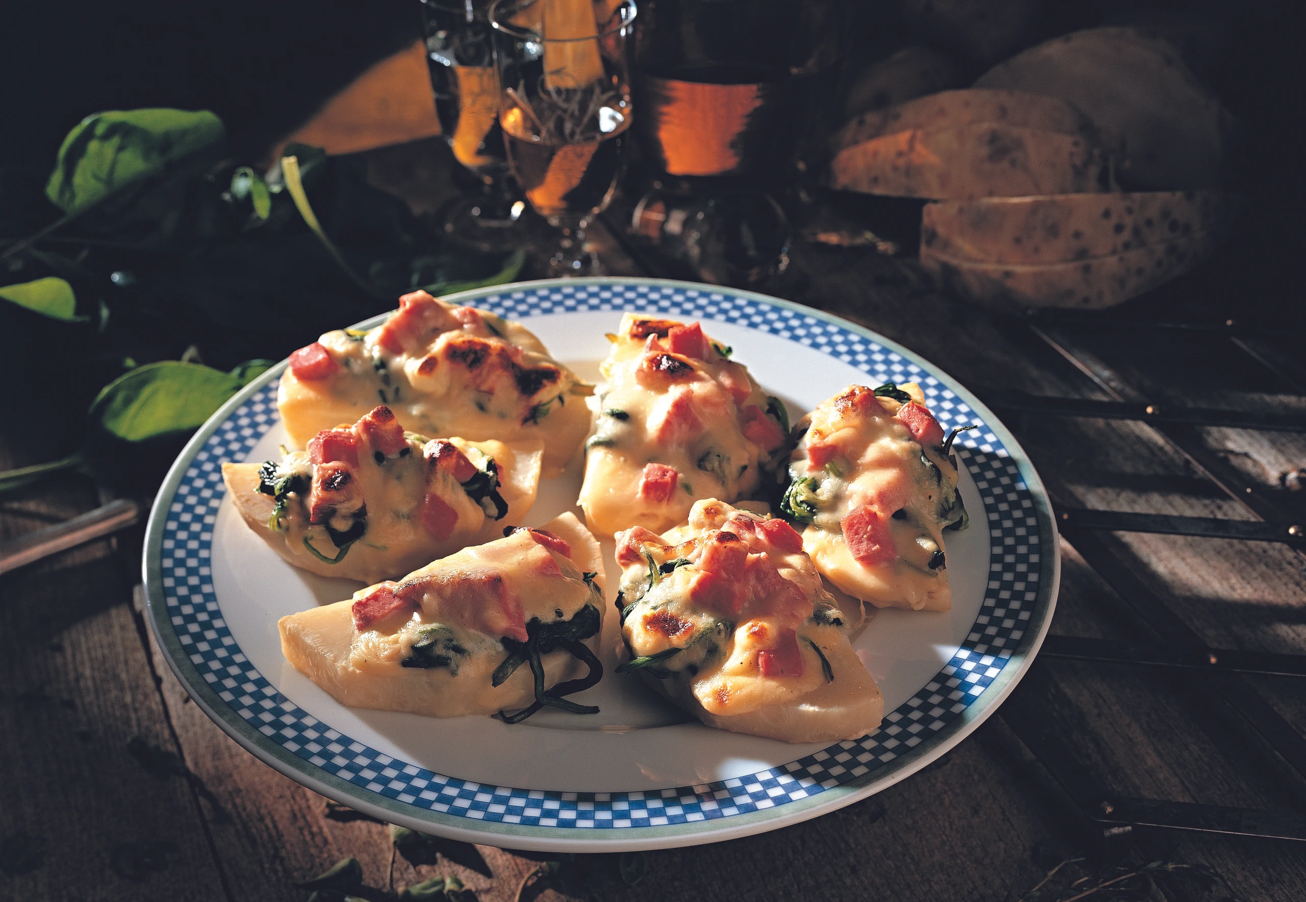 Im Sellerie-Kochwasser den Spinat kurz überkochen, abseihen, kalt abschrecken und gut ausdrücken. Selchfleisch in ca. 1 cm große Würfel schneiden. Backrohr auf Grillstellung vorheizen.