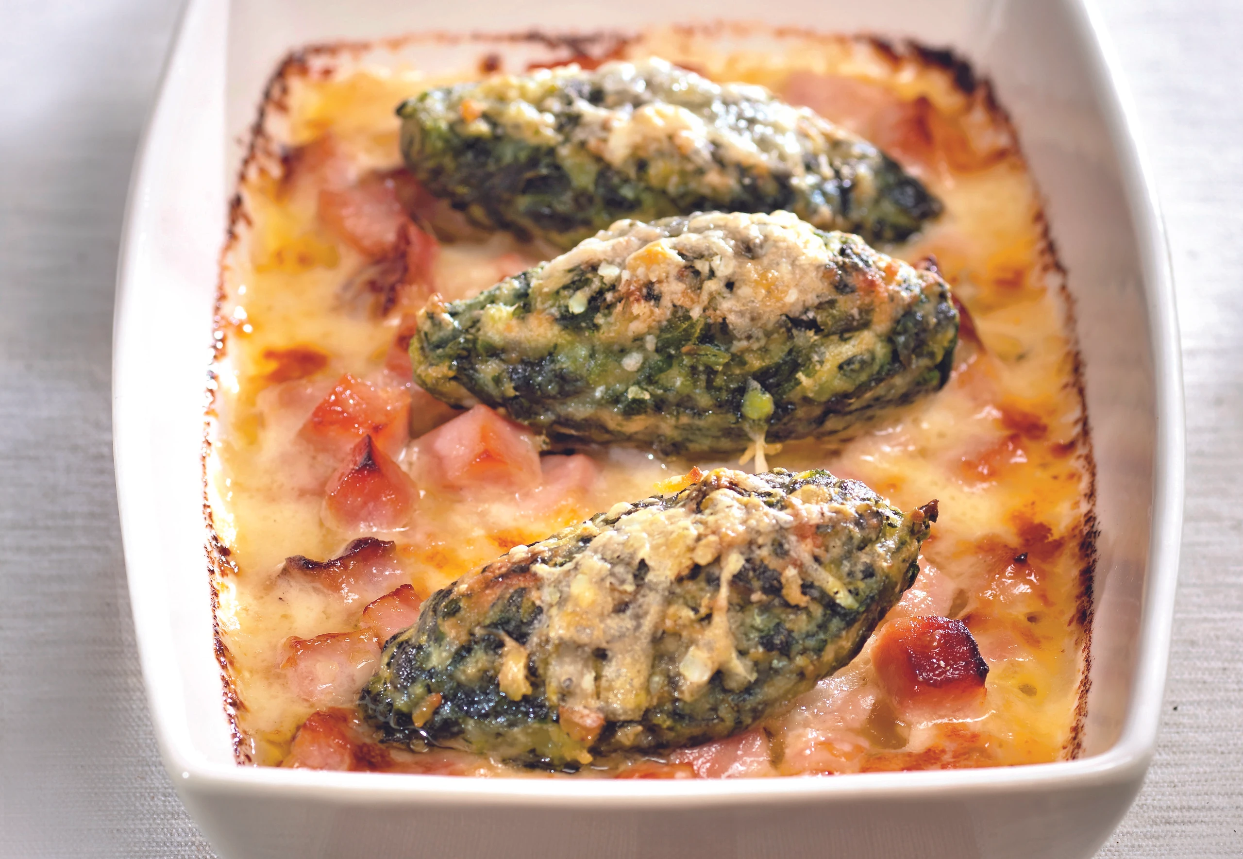 Überbackene Spinatnocken in Schinken-Oberssauce