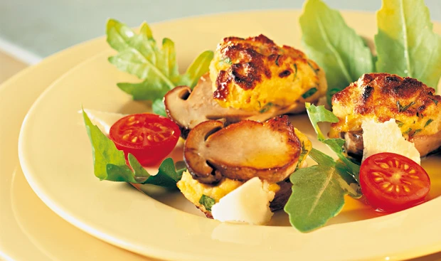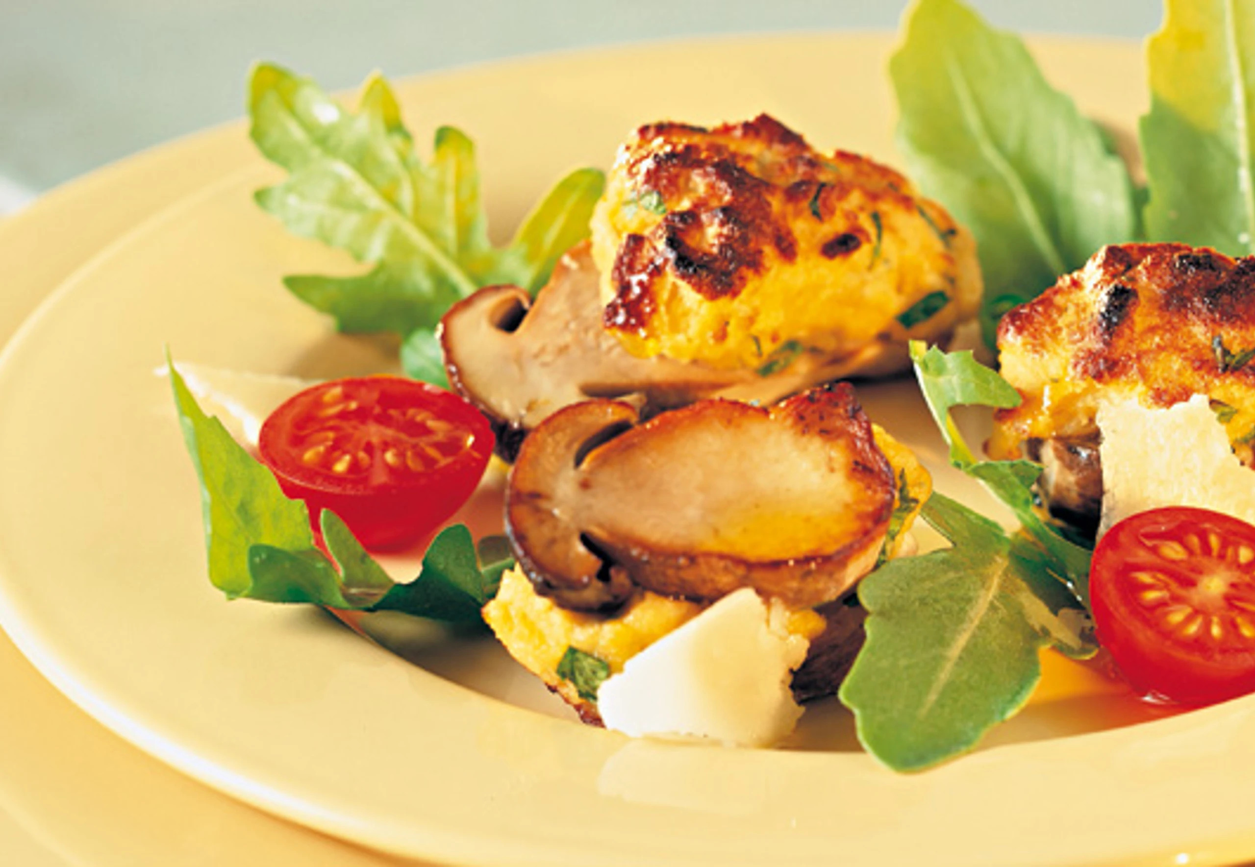 - Backrohr auf Grillstellung vorheizen. Die Steinpilze gleichmäßig mit Fülle bestreichen und im vorgeheizten Rohr (unterste Schiene) goldbraun überbacken (ca. 1 Minute). Die überbackenen Pilze sofort anrichten, mit Rucolasalat und gehobeltem Parmesan servieren.
