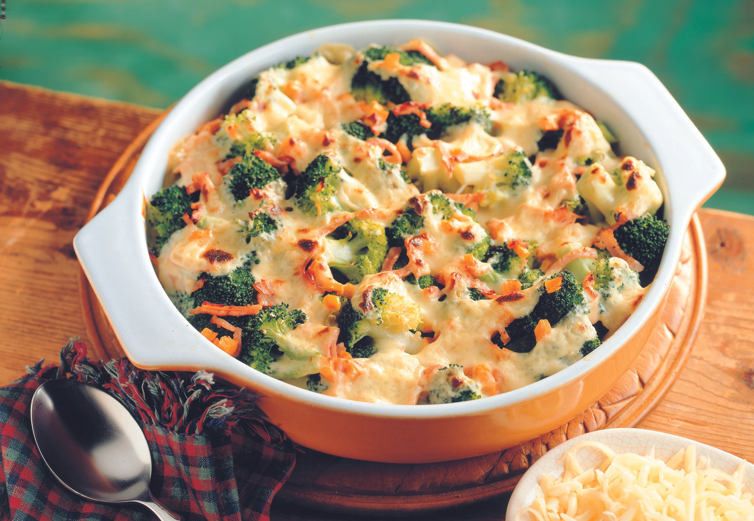 Brokkoli in der Auflaufform verteilen und mit Schinken und Karotten bestreuen. Gemüse mit der Sauce gleichmäßig übergießen und im Rohr (mittlere Schiene / Gitterrost) goldgelb überbacken (dauert 3-4 Minuten).Brokkoligratin portionieren und anrichten.