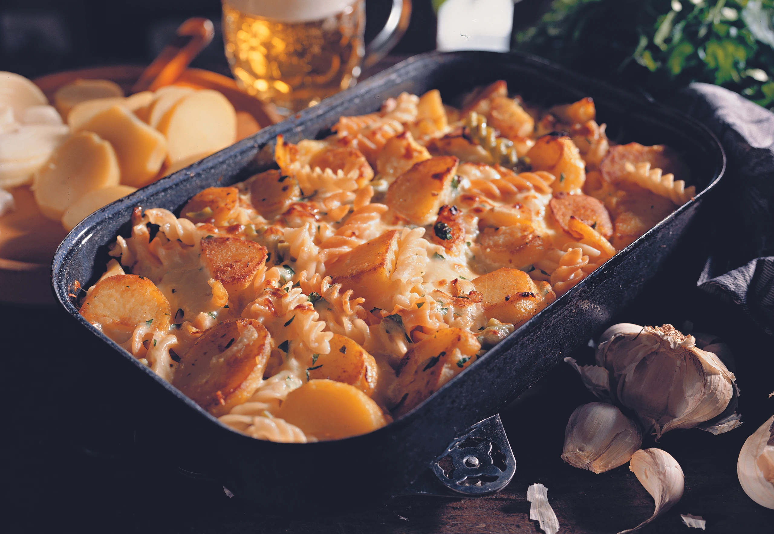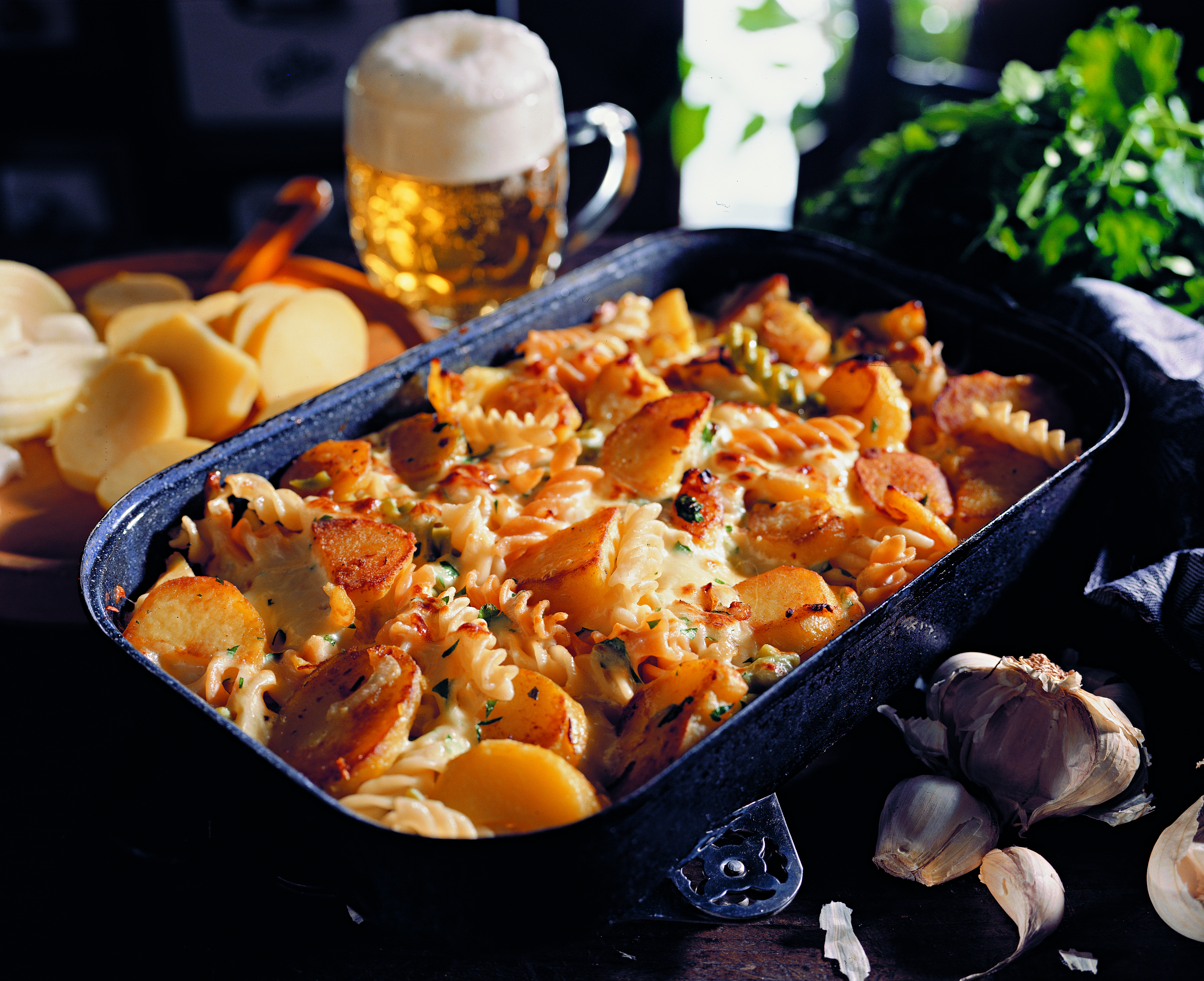 Eine ofenfeste Form mit Butter ausstreichen, Erdäpfel-Teigwarenmischung einfüllen. Sauerrahm mit Eiern und Käse und Petersilie verquirlen und über die Mischung gießen. Grenadiermarsch im Rohr goldgelb überbacken. Als Beilage serviert man am besten grünen Salat.