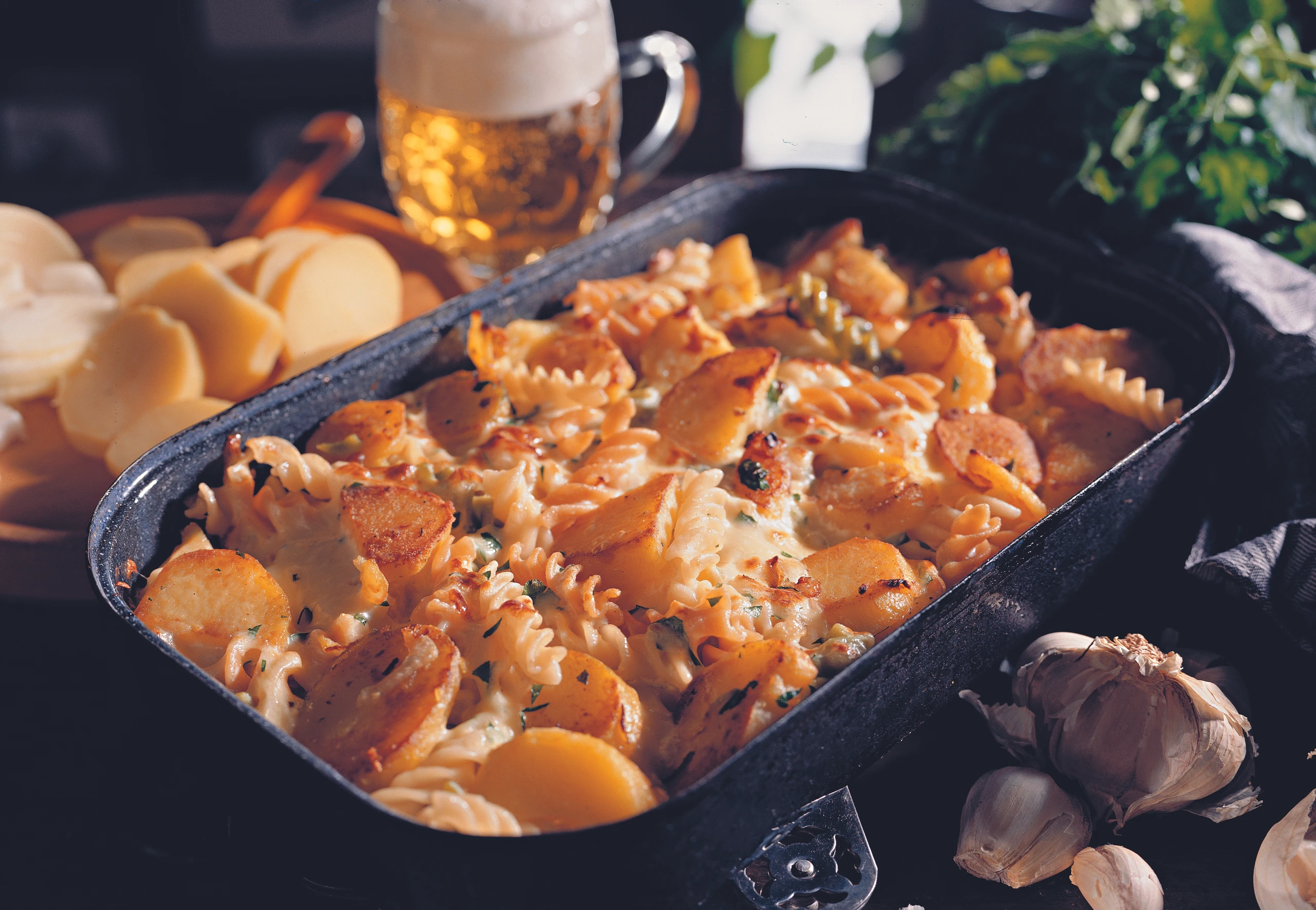 In einer Pfanne Erdäpfelscheiben in wenig Öl knusprig anbraten. Zwiebel zugeben und mitbraten. Teigwaren daruntermischen und mit Salz, Pfeffer und Majoran würzen. Backrohr auf starke Oberhitze oder Grillstellung vorheizen.