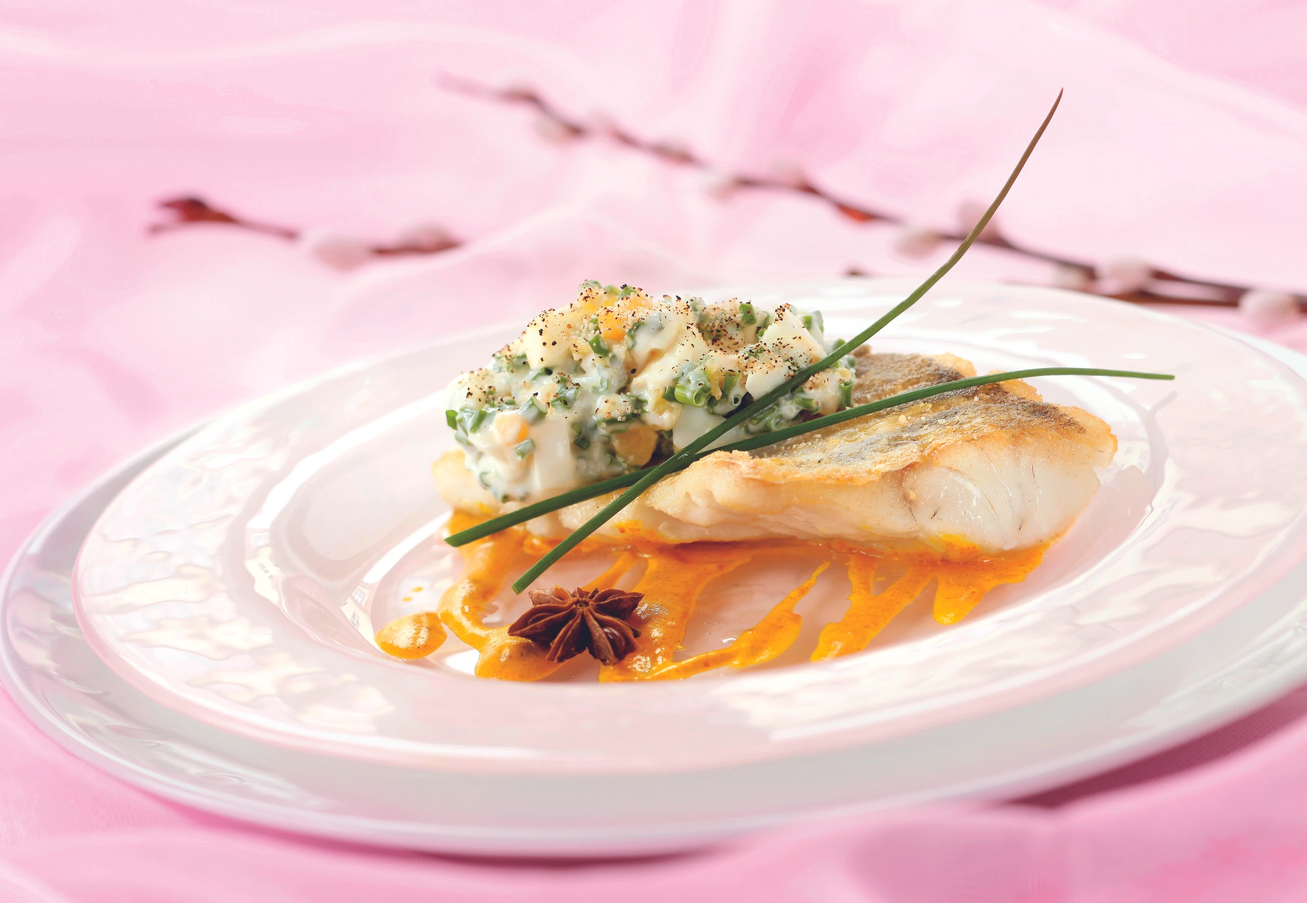 Rohr auf 200°C vorheizen. Zanderfilets ins Rohr (mittlere Schiene / Gitterrost) stellen und ca. 10 Minuten überbacken. Parallel dazu Sauce aufkochen, Butter einrühren und die Sauce mit einem Stabmixer aufschlagen. Zanderfilets mit der Sauce anrichten und mit Schnittlauch garniert servieren.