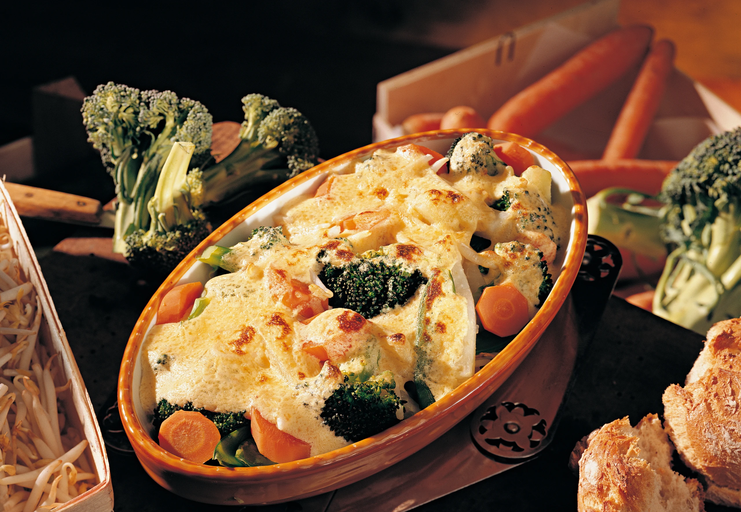 Backrohr auf Grillstellung vorheizen. Gemüse in aufgeschäumter Butter erwärmen, in die Auflaufform schichten und mit der Sauce gleichmäßig übergießen. Gemüse im vorgeheizten Rohr überbacken.