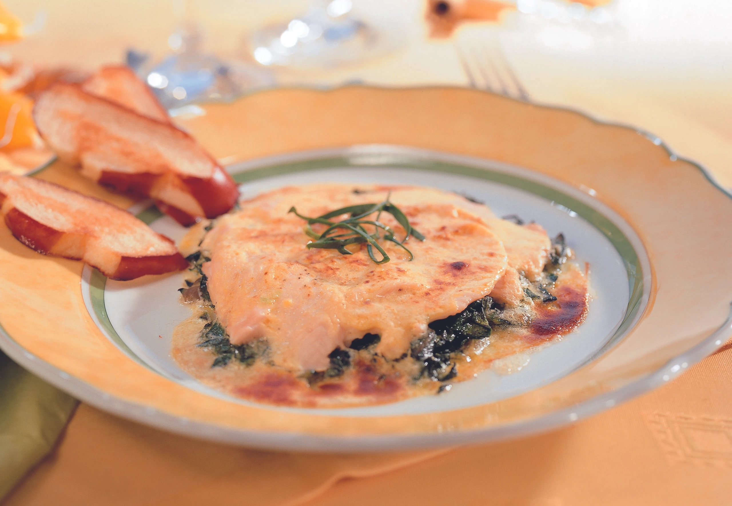 - Teller dünn mit Öl bestreichen, in der Mitte den Mangold anrichten. Lachsforelle in dünne Scheiben schneiden. Mangold mit den Lachsforellenscheiben belegen und mit Salz und Pfeffer würzen.