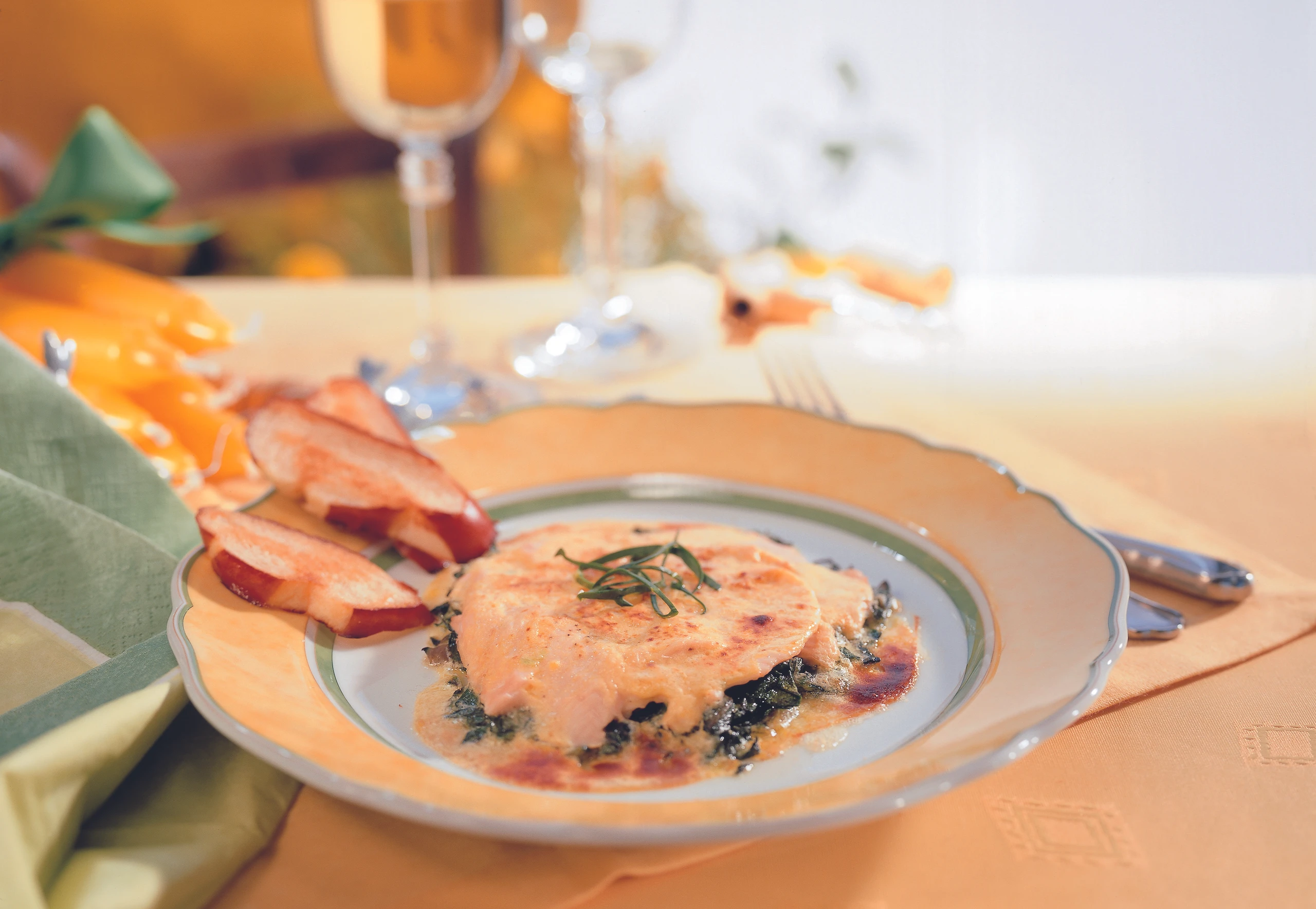 Überbackenes Lachsforellenfilet auf Mangold