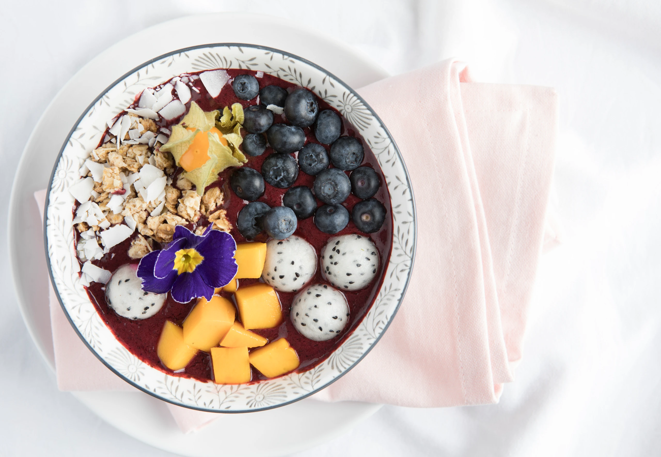 Alle Zutaten für den Smoothie pürieren und kalt stellen. Mango schälen und würfeln. Drachenfrucht halbieren und mit einem Parisienneausstecher Kugeln ausstechen. Smoothie in Schüsseln verteilen, mit Früchten, Müsli und Blüten dekoriert servieren.