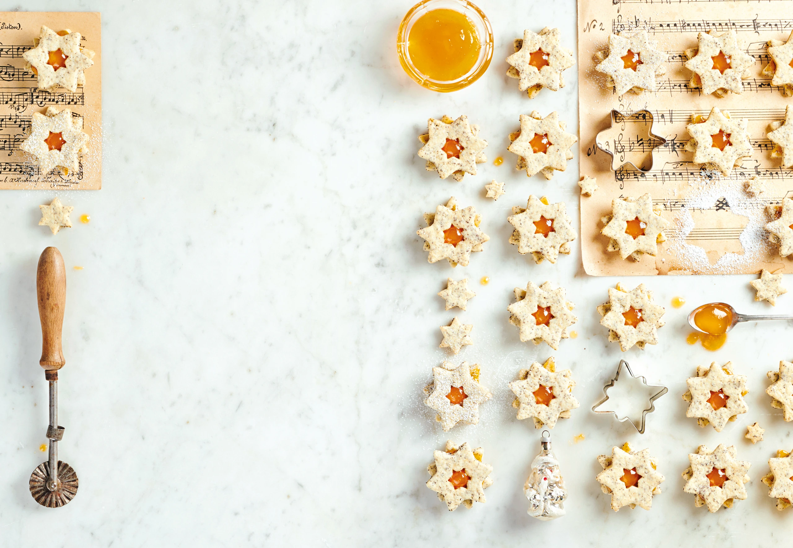 Teig kurz verkneten und auf einer leicht bemehlten Arbeitsfläche ca. 4 mm dick ausrollen. Sterne ausstechen. Aus der Hälfte kleinere Sterne ausstechen. Kekse auf die Bleche legen und nacheinander im Rohr (mittlere Schiene) ca. 8 Minute backen. Herausnehmen und auskühlen lassen.