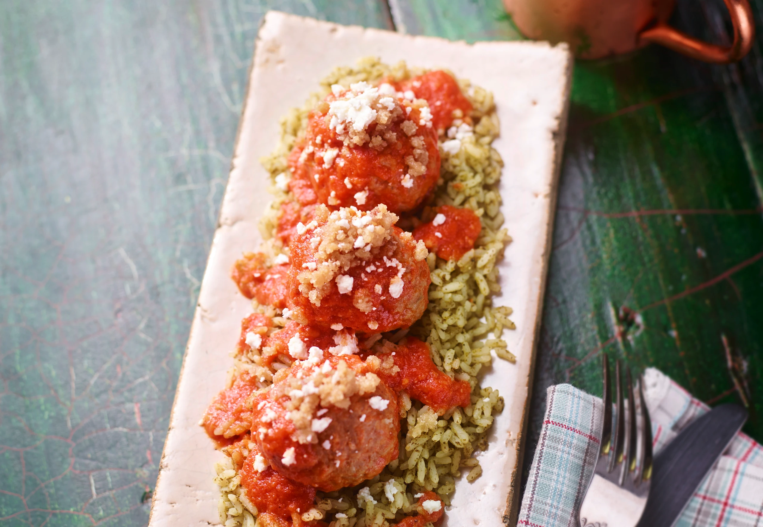 Reis mit Sauce und Fleischbällchen anrichten, mit knuspriger Schwarte und Schafkäse bestreuen.