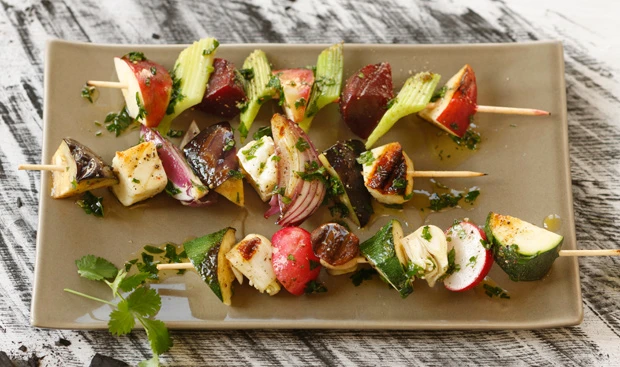 - Alle Zutaten nach Belieben auf Holzspieße stecken und mit Öl beträufeln. Auf den heißen Grill legen und ca. 5 Minuten grillen.