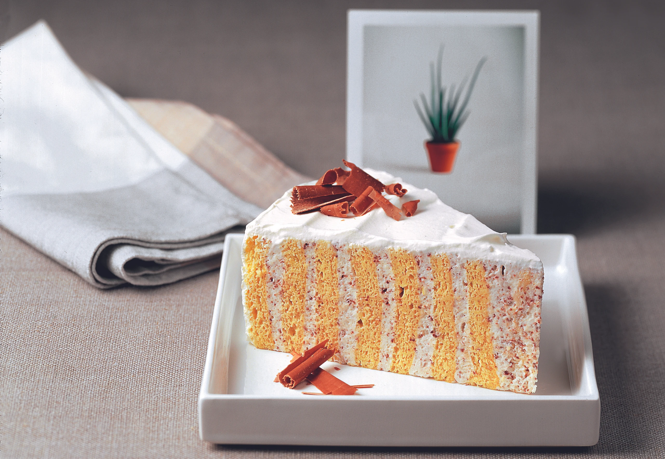 Torte aus der Form lösen. Obers schlagen und die Torte damit rundum wellenförmig einstreichen, mit Schokoladespänen garnieren.