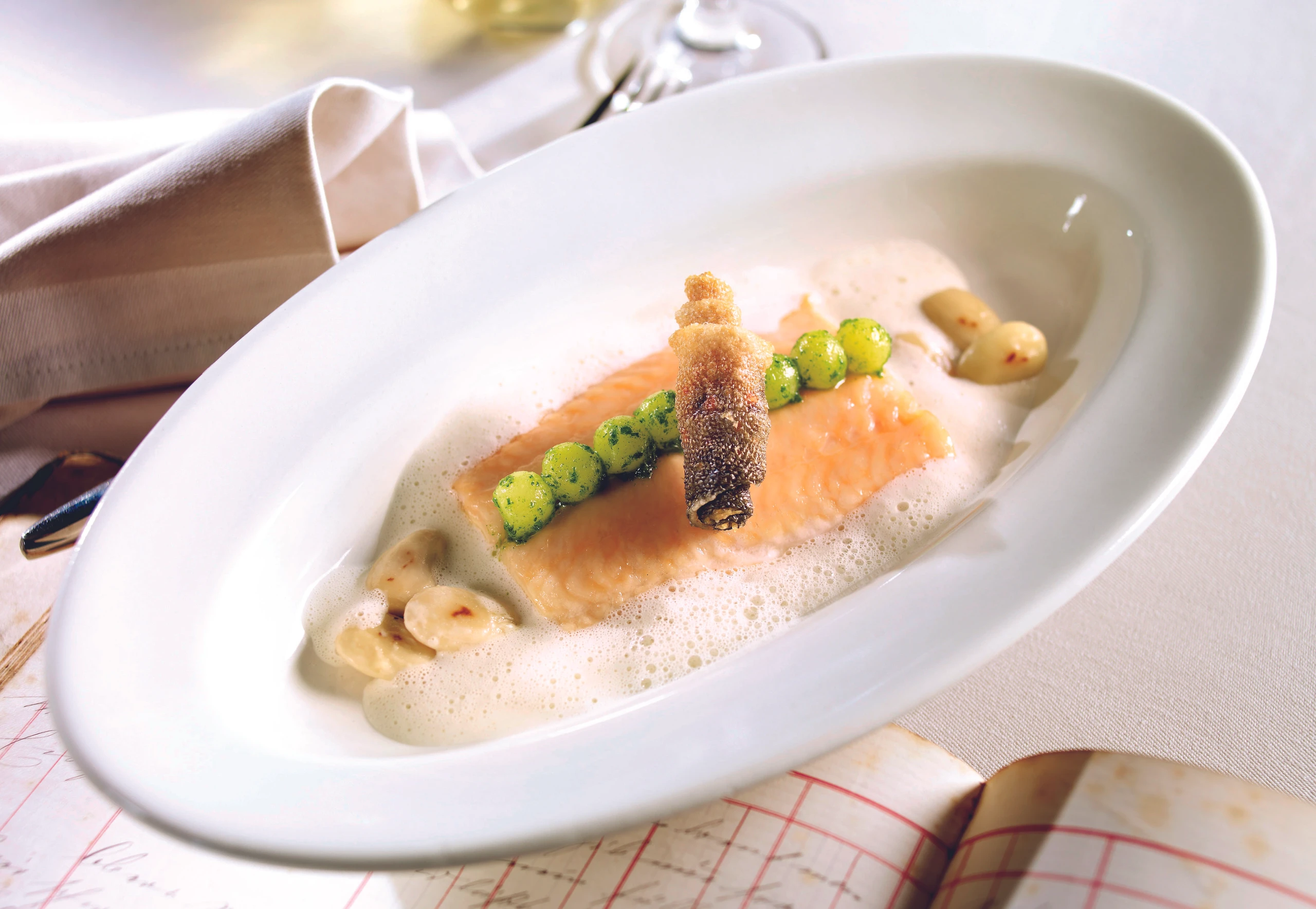 - Filets aus dem Fond heben. Fond passieren und mit übriger kalter Butter schaumig aufschlagen. Filets mit Schaum und Mandeln anrichten und mit erwärmten Erdäpfelkugeln und Knusperhaut garnieren.
