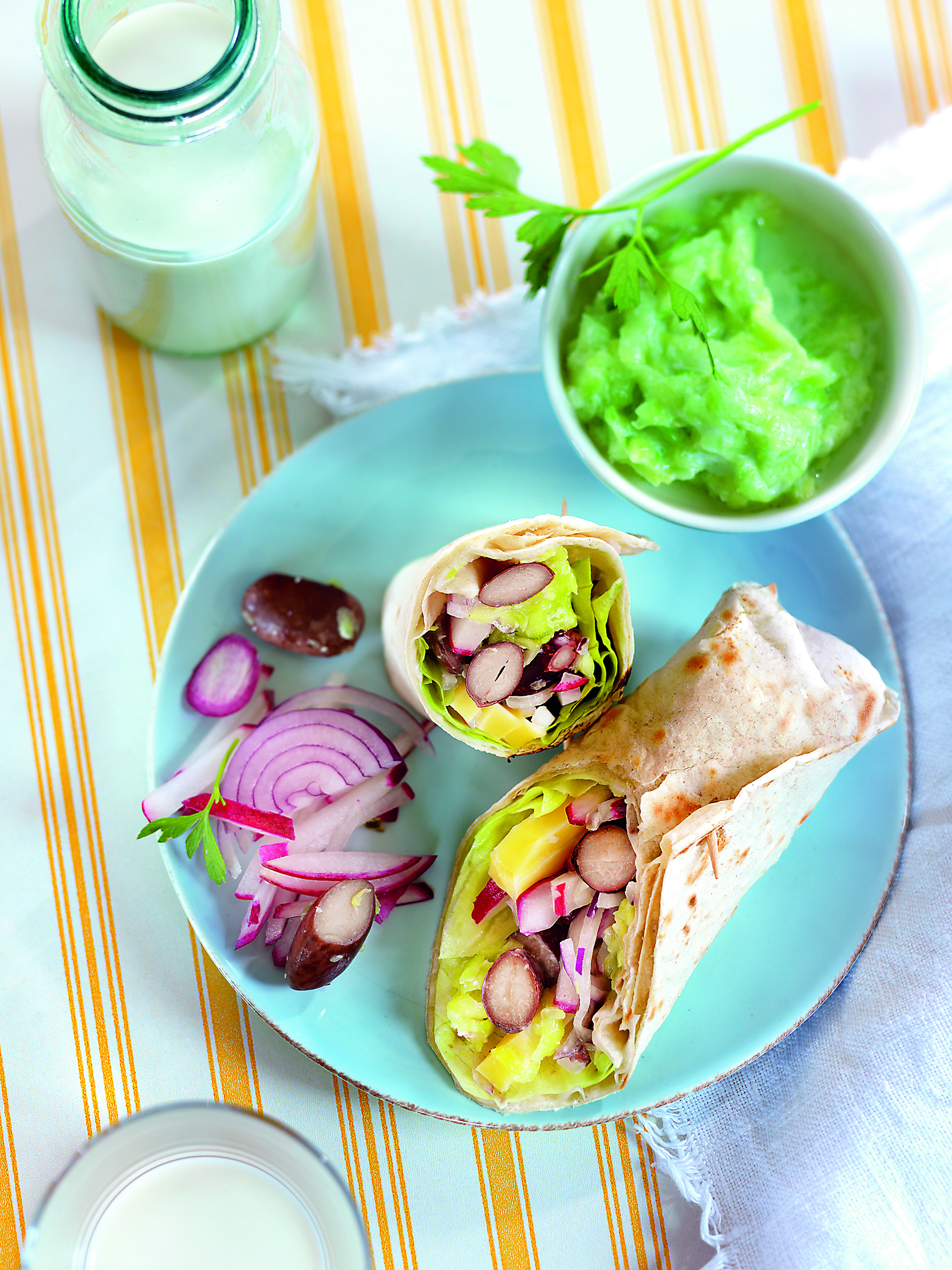 Wrap-Tortillas seitlich etwas einschlagen, aufrollen. Wraps mit Zahnstochern fixieren und halbieren. Restliche Gurkensalsa dazu reichen.