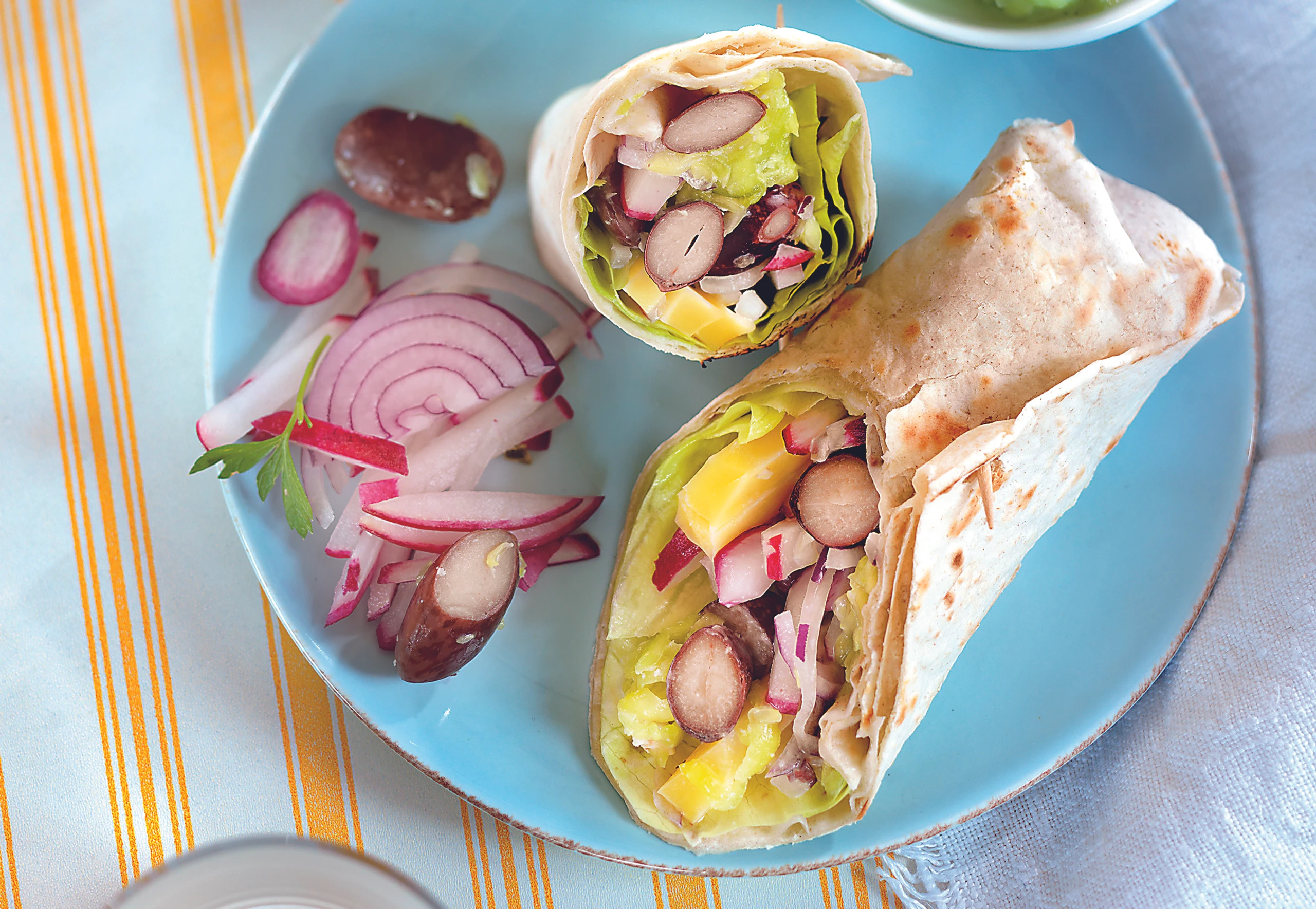 In die Mitte jedes Wraps einige Salatstücke legen, Käse, Radieschen, Zwiebelscheiben und Käferbohnen darauf geben. Etwas Salsa über der Füllung verteilen.
