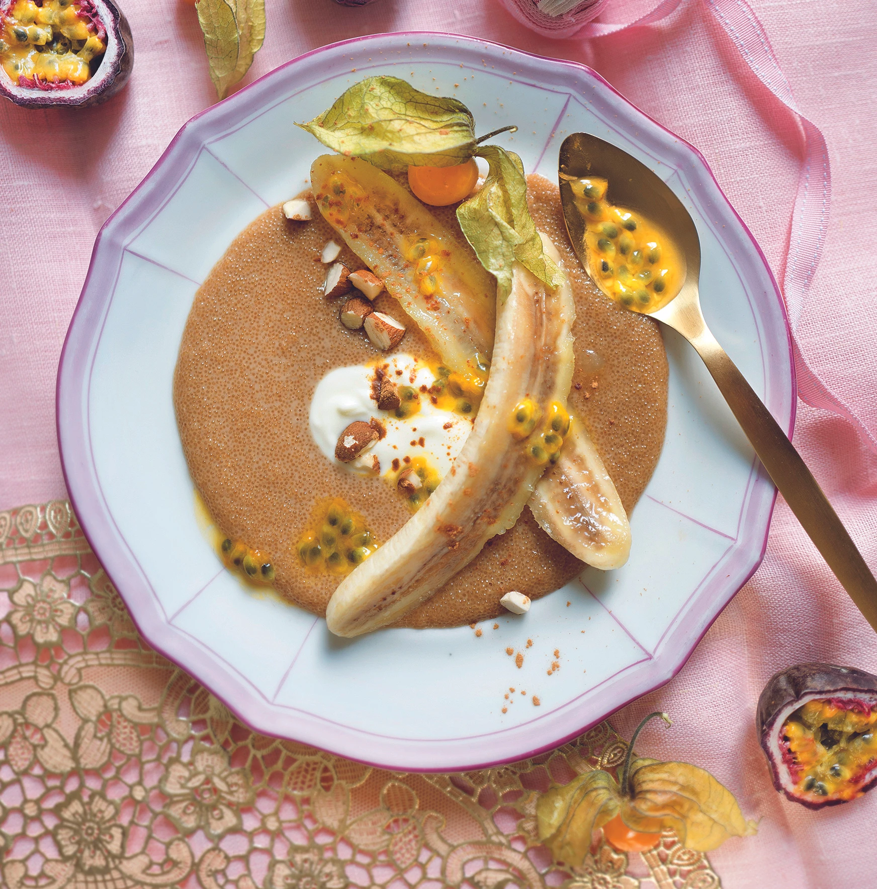 Amaranthcreme mit gebratenen Bananen und Joghurt anrichten, mit Mandeln bestreuen, mit Passionsfrucht und Physalis garnieren, mit einer Prise Zimt bestreuen.