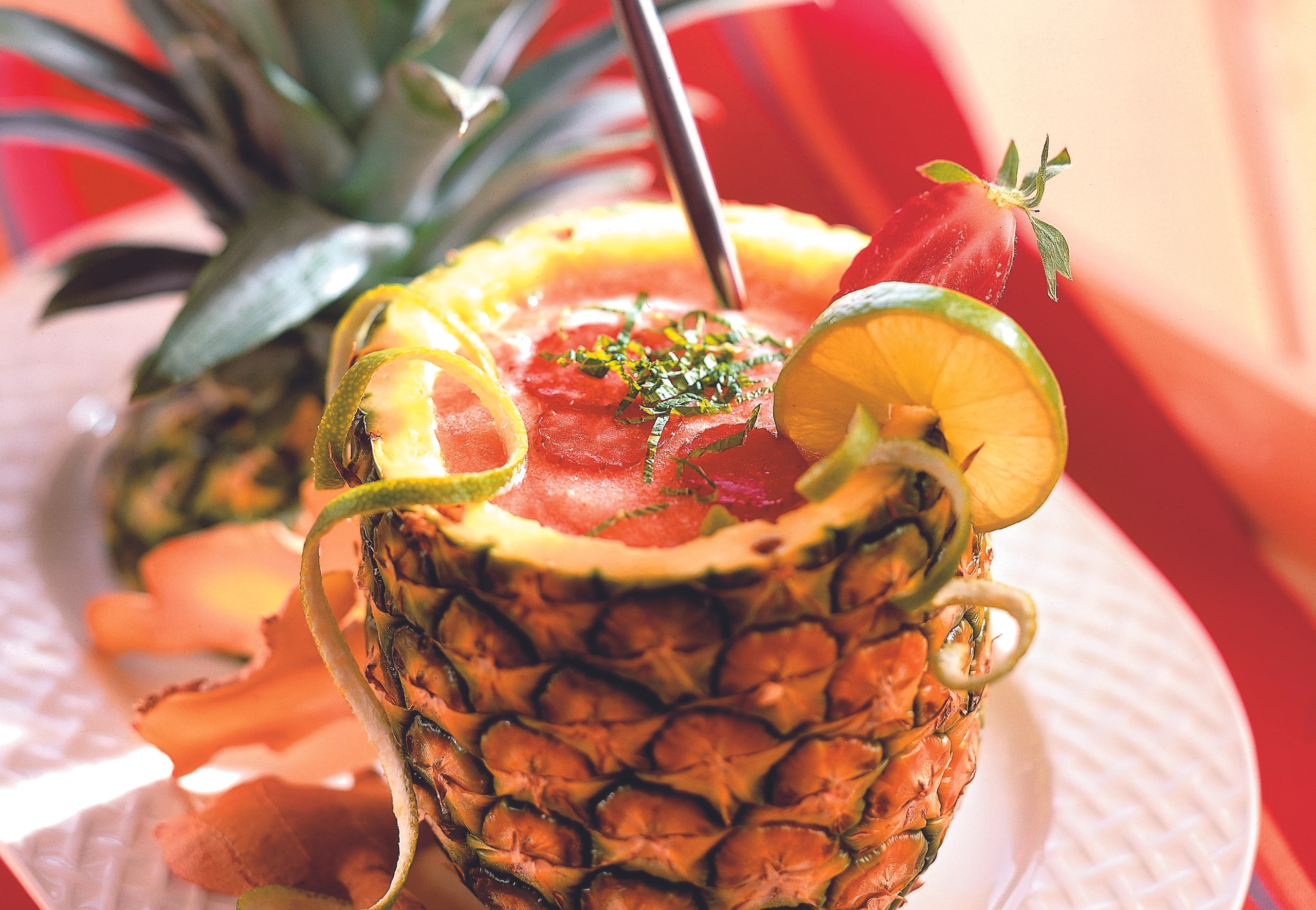 - Vor dem Servieren Kaltschale eventuell mit gut gekühltem Sekt aufspritzen und in die Ananas füllen. Zitronenmelisse fein schneiden. Ananas mit den reservierten Erdbeeren und mit Zitronenmelisse garnieren.