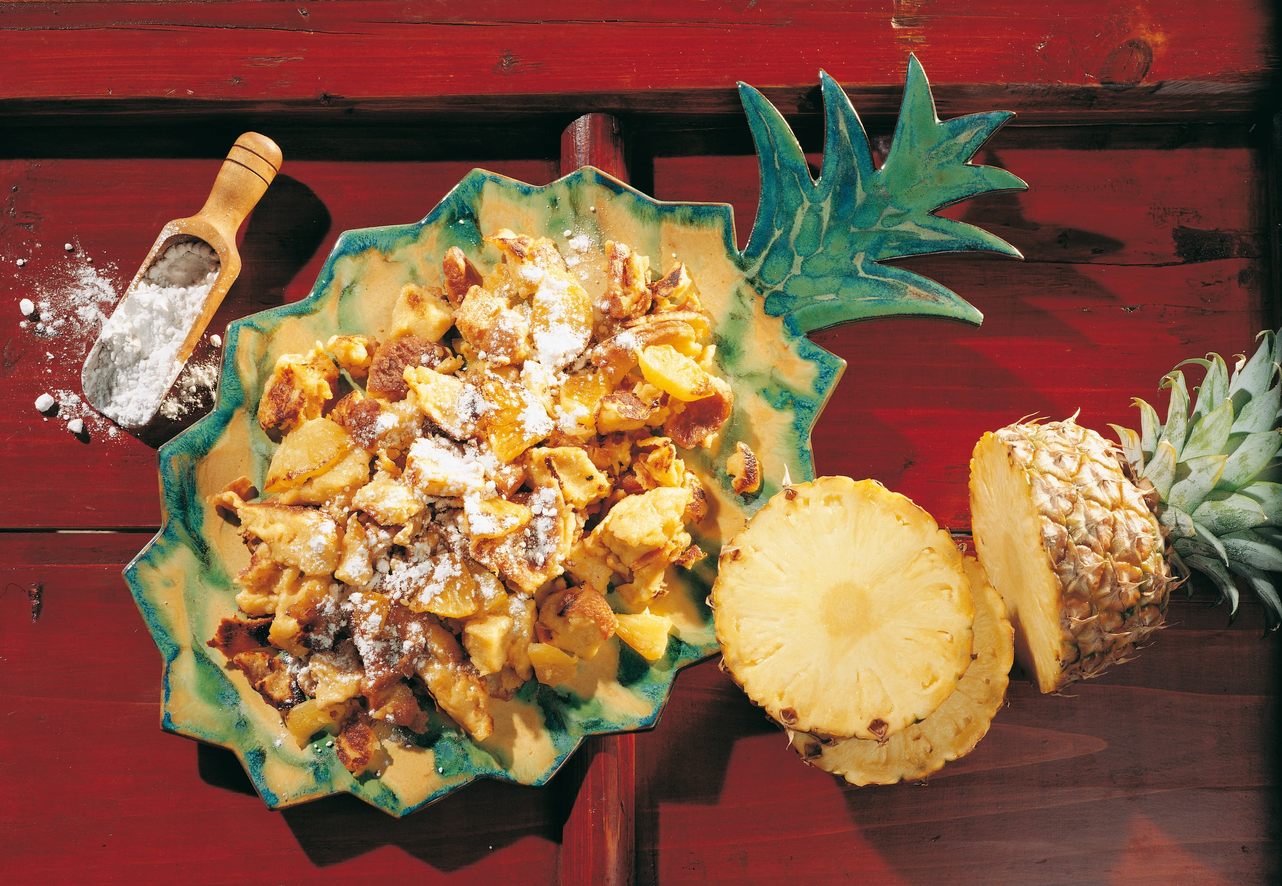 In einer großen Pfanne (beschichtet; unbedingt mit backrohrtauglichem Griff!) auf kleiner Flamme 1 EL Öl erhitzen. Teig eingießen, verteilen, mit Ananasstücken bestreuen, kurz anbacken und im vorgeheizten Rohr (mittlere Schiene / Gitterrost) ca. 1/4 Stunde backen, wenden und nochmals 1/4 Stunde backen.