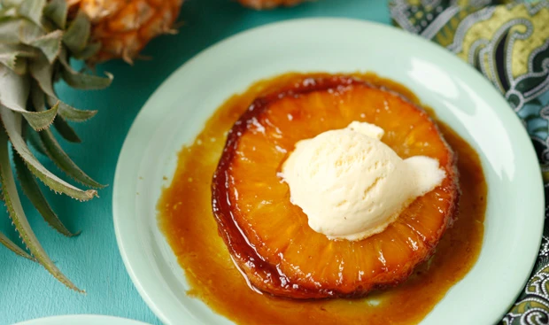 - Ananas schälen, in 2 cm dicke Scheiben schneiden, Strunk ausstechen. Scheiben in die Förmchen legen. Zucker mit Wasser hell karamellisieren lassen, vom Herd nehmen und die Butter einrühren. Karamell auf den Ananas verteilen. Teigscheiben über die Ananas legen, an den Rändern einschlagen und andrücken.