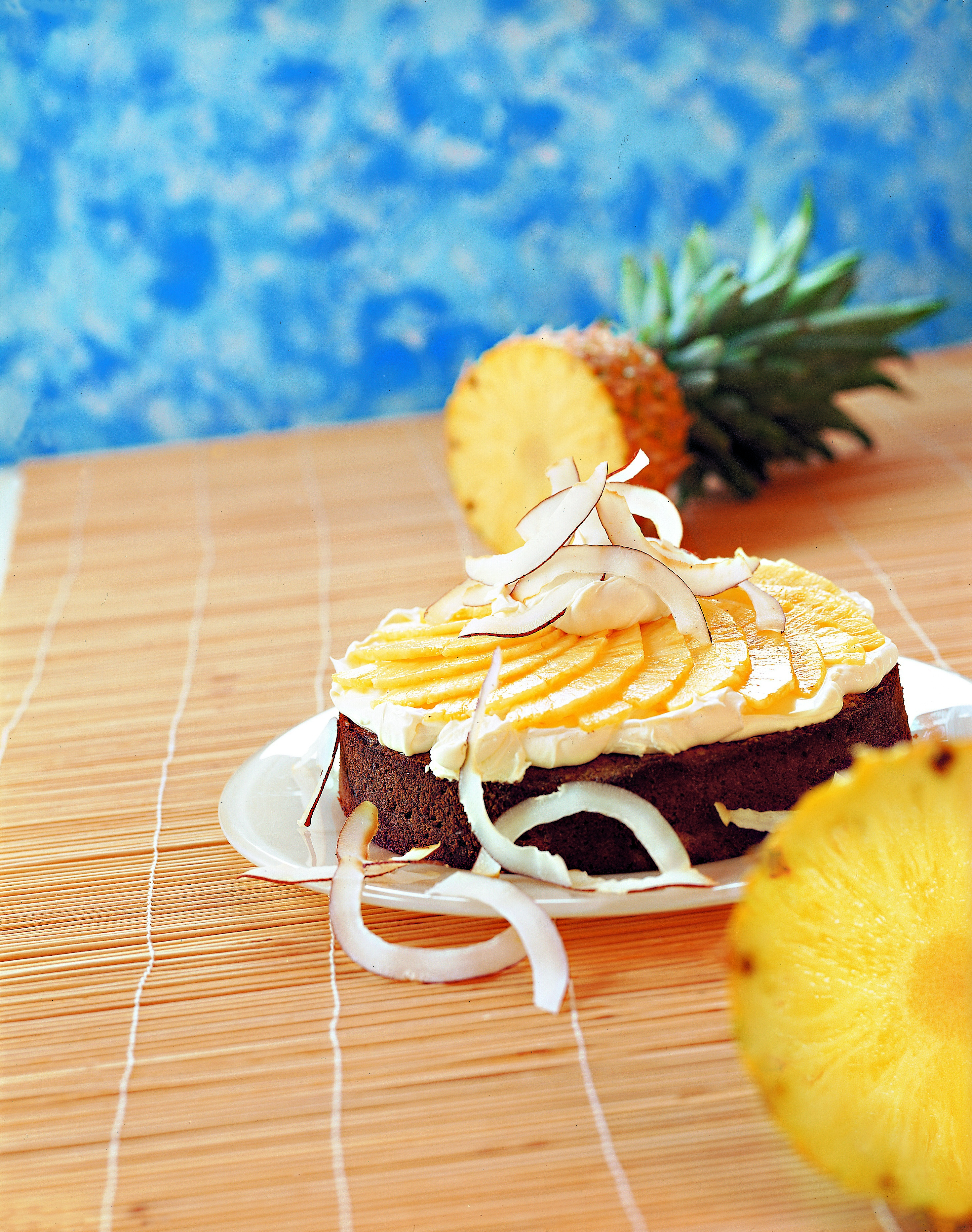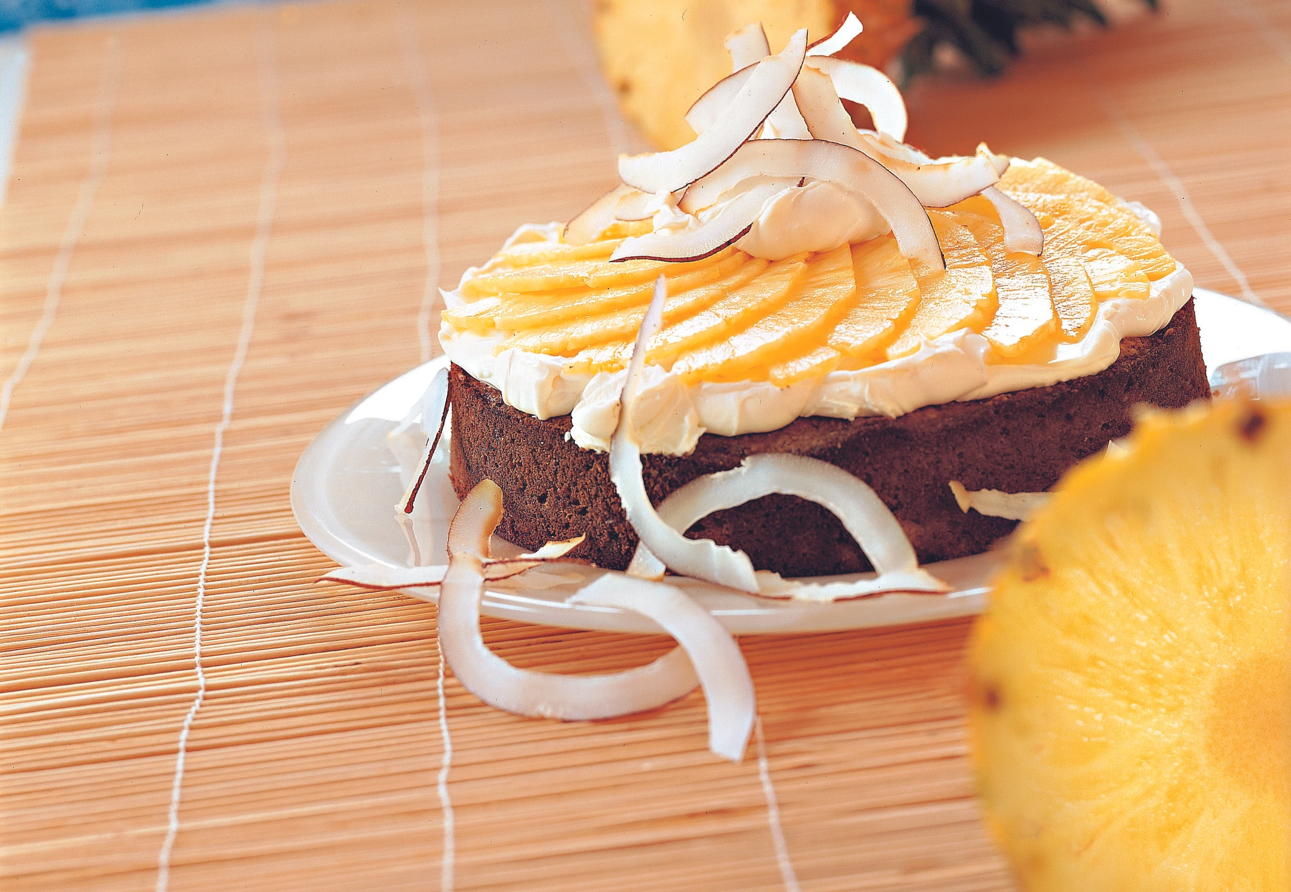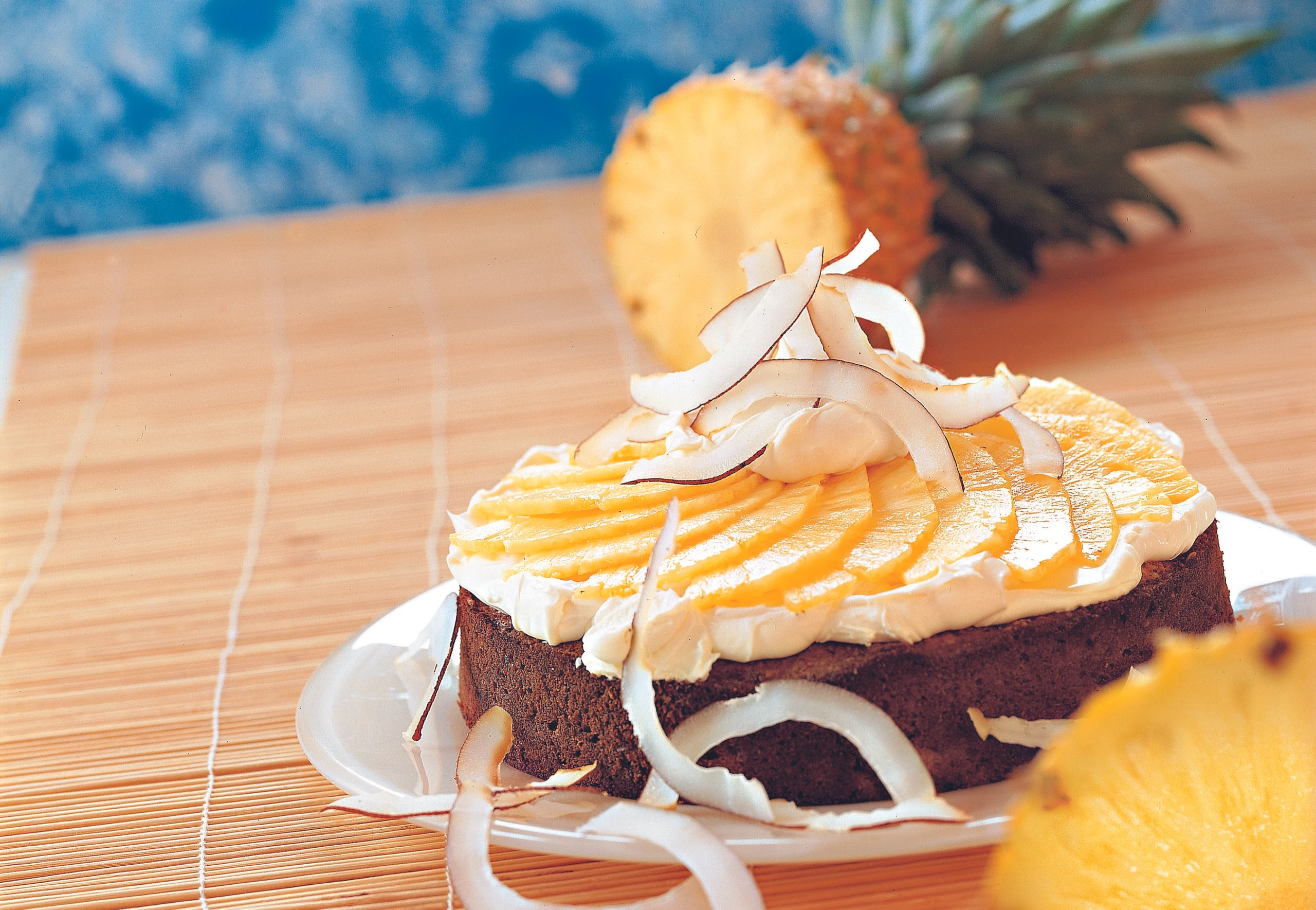 Torte mit der Creme bestreichen, mit den Ananasscheiben belegen und mit Kokosstreifen verzieren.