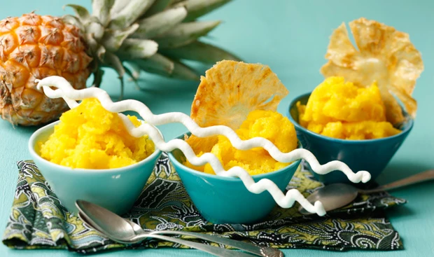 - Ananas schälen, halbieren und den Strunk ausschneiden. Für das Granité Kurkuma mit Wasser vermischen und auf ca. 2 EL einkochen. Reduktion abseihen. Die Hälfte vom Ananas-Fruchtfleisch in ca. 0,5 cm große Stücke schneiden, mit Ingwer, Limettenschale, Reduktion und 80 g Kristallzucker fein pürieren. Mischung in ein flaches Gefäß füllen und 6 Stunden im Tiefkühlfach gefrieren lassen.