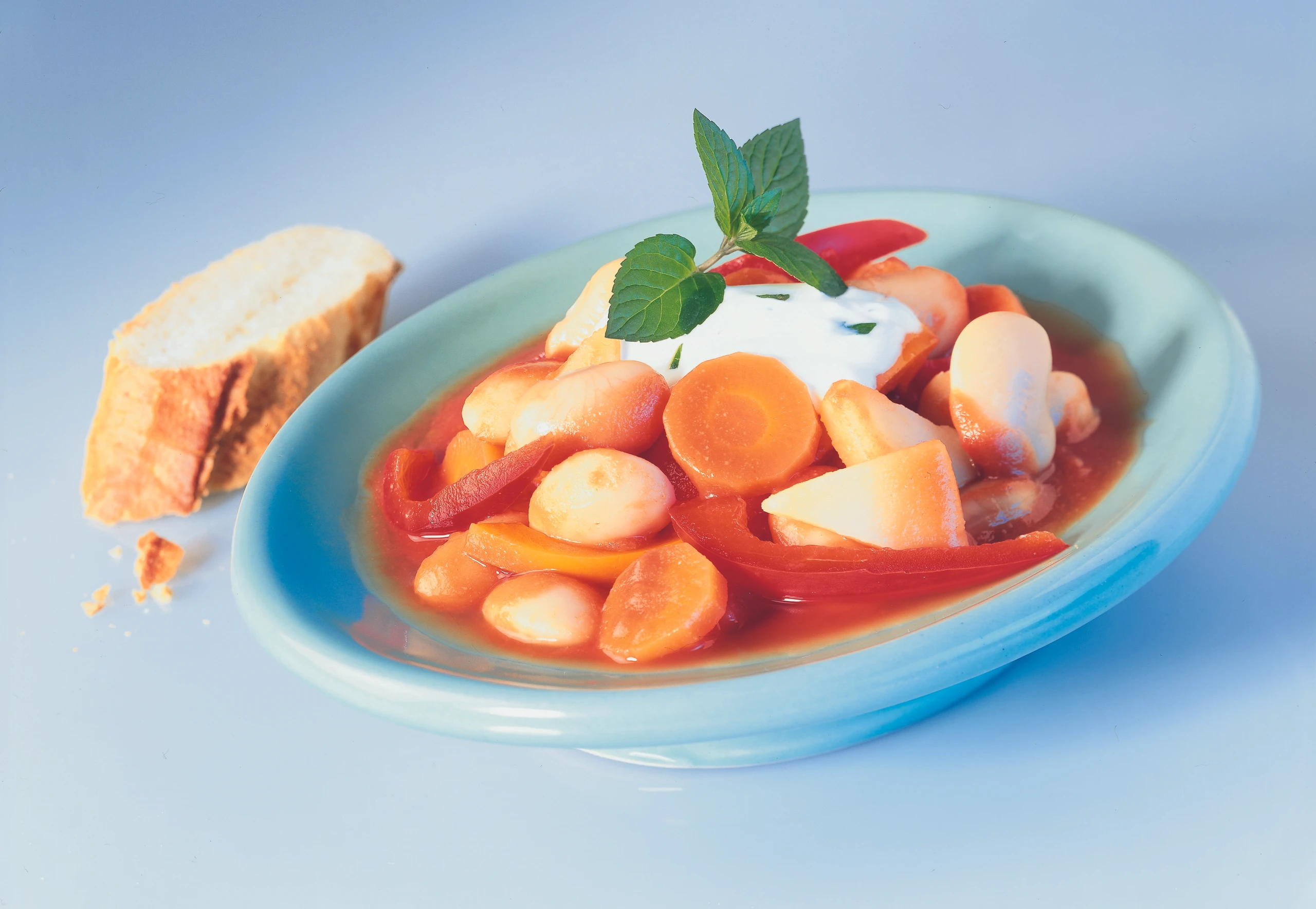 Kartoffel und Karotte schälen und in Scheiben schneiden, Paprika in Streifen schneiden. Bohnen, Kartoffel, Karotten und Paprika in den abgetropften Römertopf geben, wenig salzen und mit der Sauce übergießen. Römertopf verschließen.