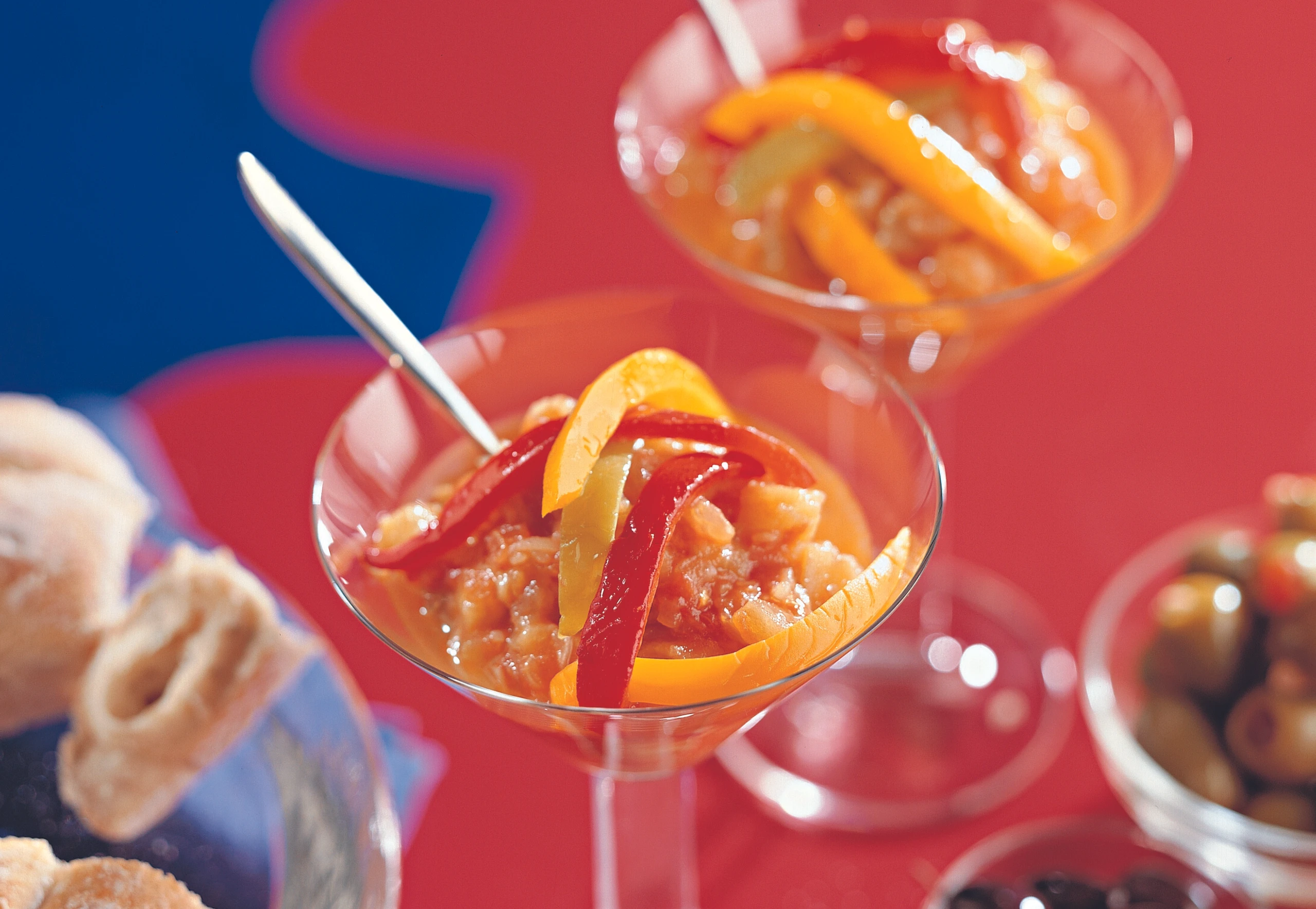 Für die Garnitur je ein Viertel der grünen, roten und gelben Paprika in Streifen schneiden. Restliche Paprika fein würfeln, mit dem Paprikasaft unter den Pisto mischen und noch 5 Minuten leicht kochen. Pisto mit Salz abschmecken, anrichten und mit den Paprikastreifen garnieren.
