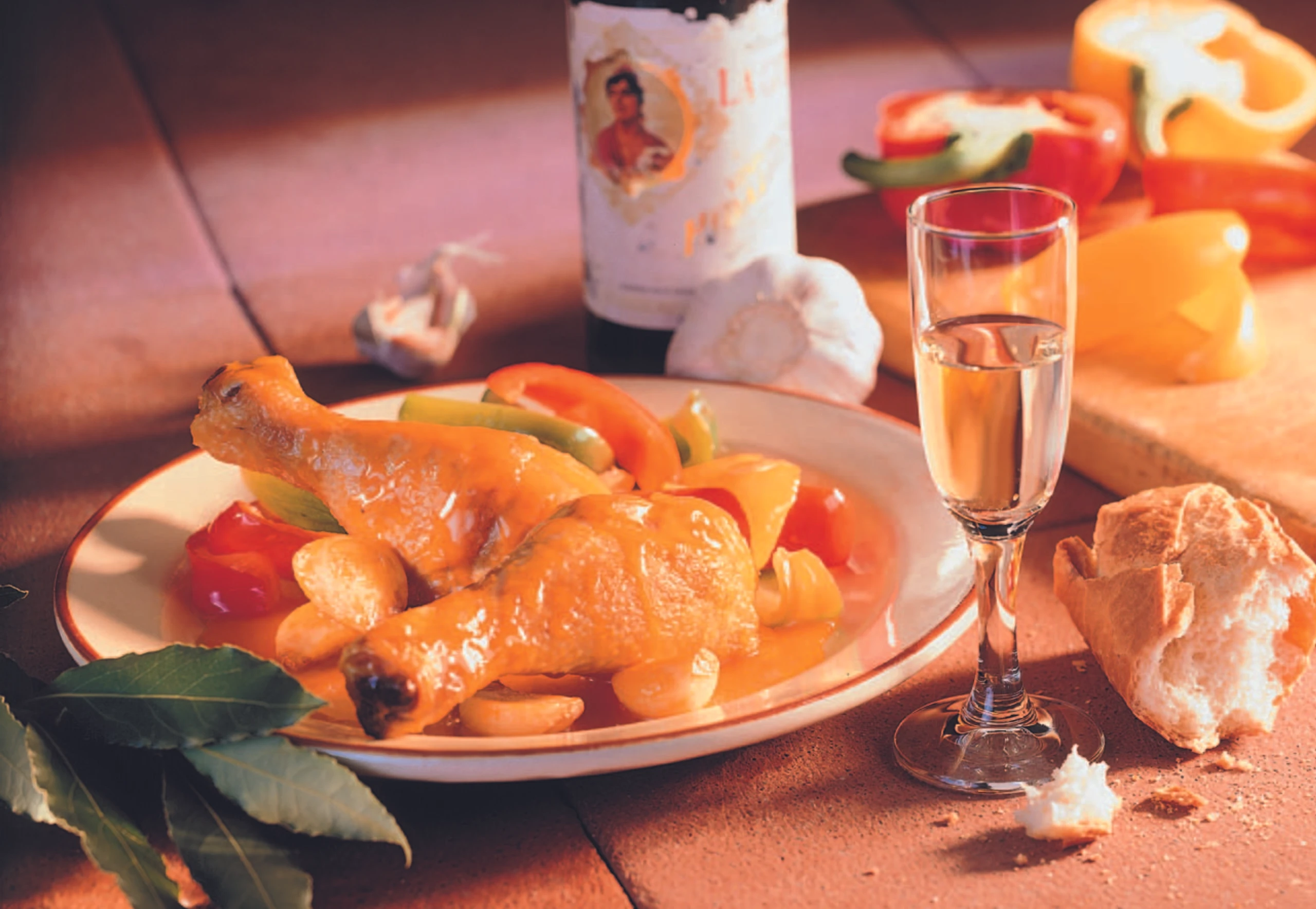 Hühnerstücke auf zweimal im heißen Öl rundum anbraten. Knoblauch, Paprika und Paradeiser zugeben, mit Sherry und Suppe aufgießen. Mit Lorbeerblättern, fein zerriebenen Safranfäden, Salz und Pfeffer würzen.