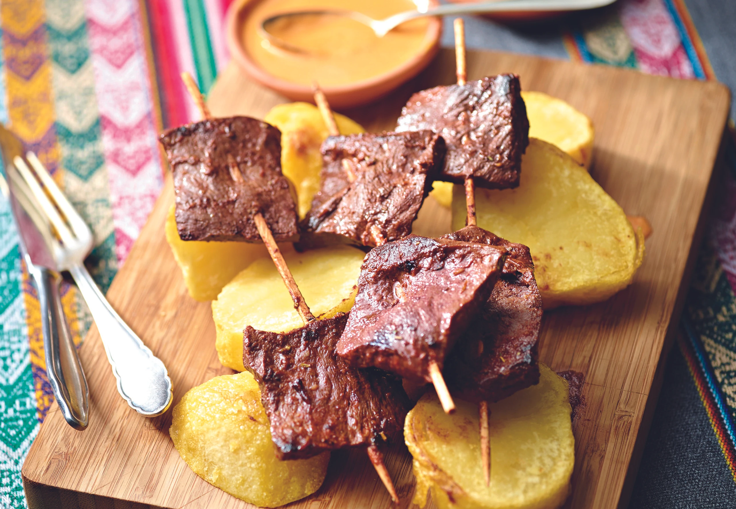 Anticucho: Mariniertes Rinderherz mit scharfer Sauce und Sauce Tartare
