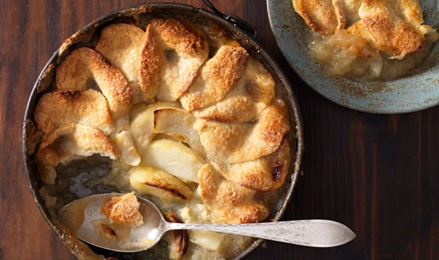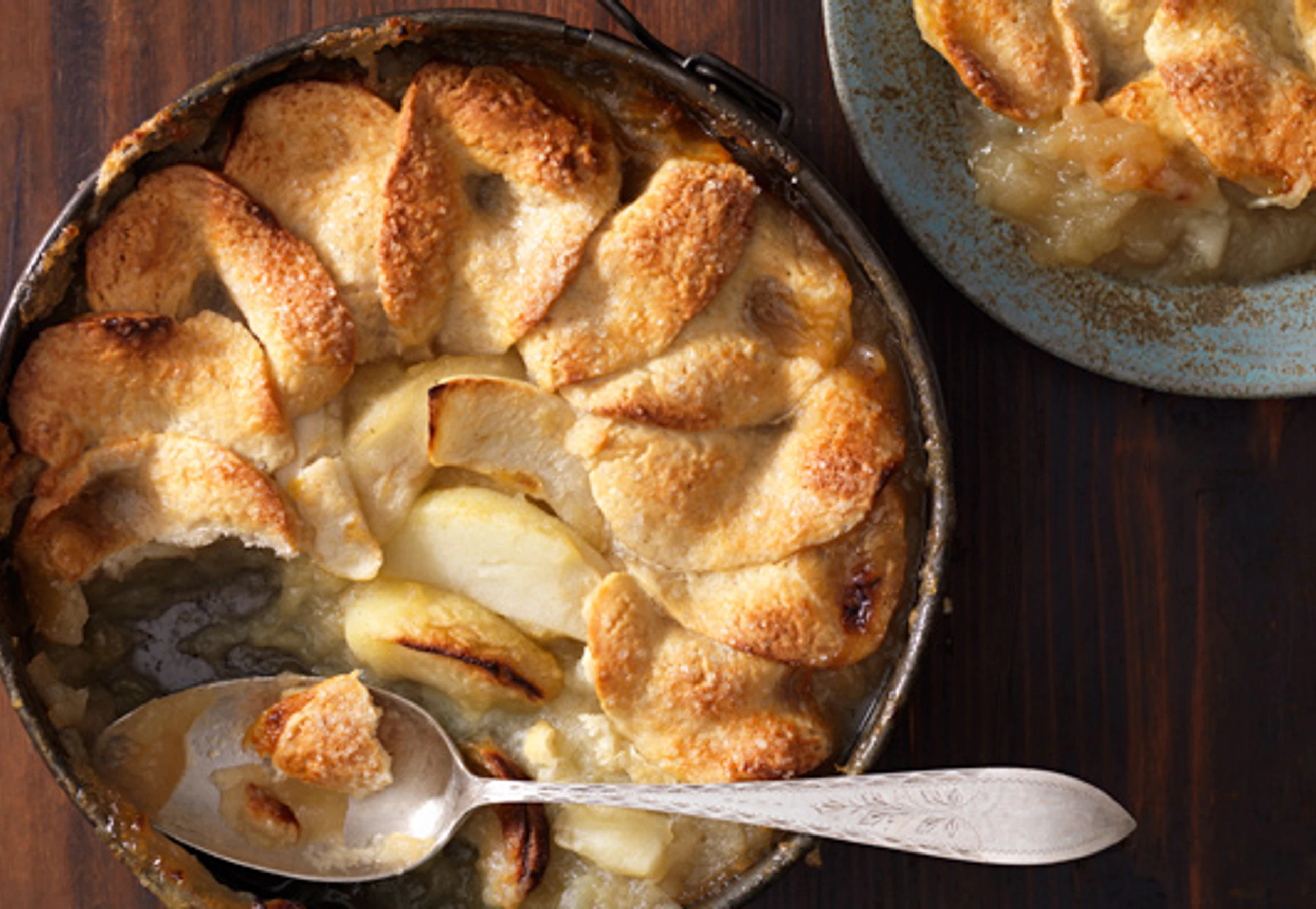 - Teig in ca. 4 mm dicke Scheiben schneiden, flach drücken und entlang des Formenrandes dachziegelartig auf die Äpfel legen. Teig mit Milch bestreichen und mit Zucker bestreuen. Crumble im Rohr (mittlere Schiene / Gitterrost) ca. 18 Minuten backen.
