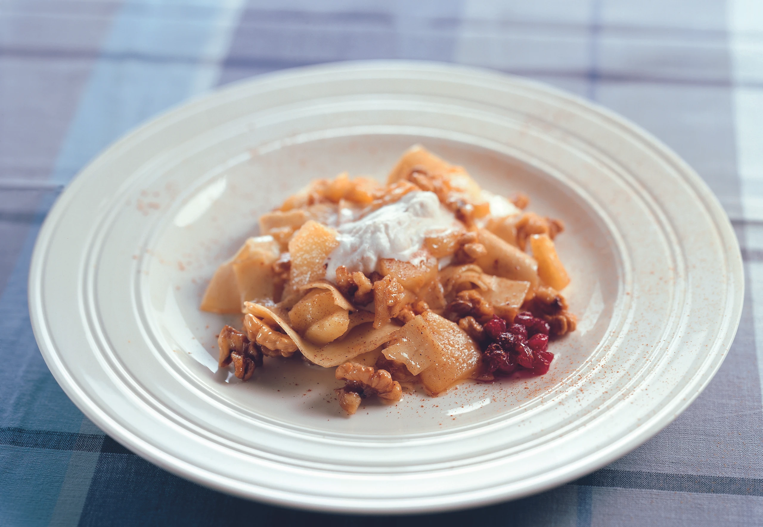 Fleckerl kurz mit heißem Wasser abspülen, gut abtropfen lassen und mit der Apfelnussmischung vermengen. Fleckerl mit wenig Zimt bestreuen und mit Obers und Preiselbeeren garnieren.