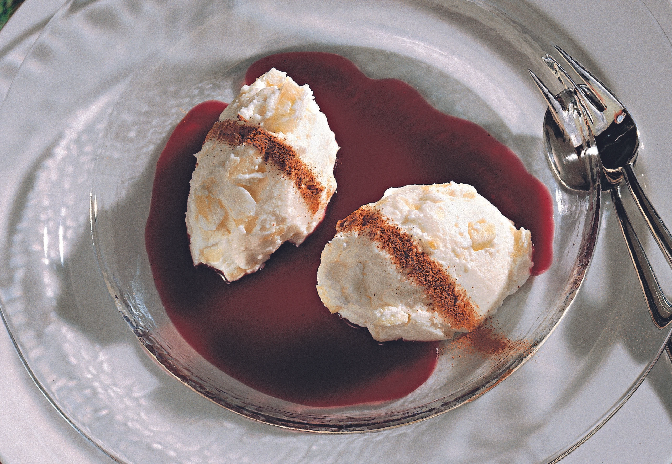 Apfel-Joghurt-Nockerl auf kalter Glühweinsauce