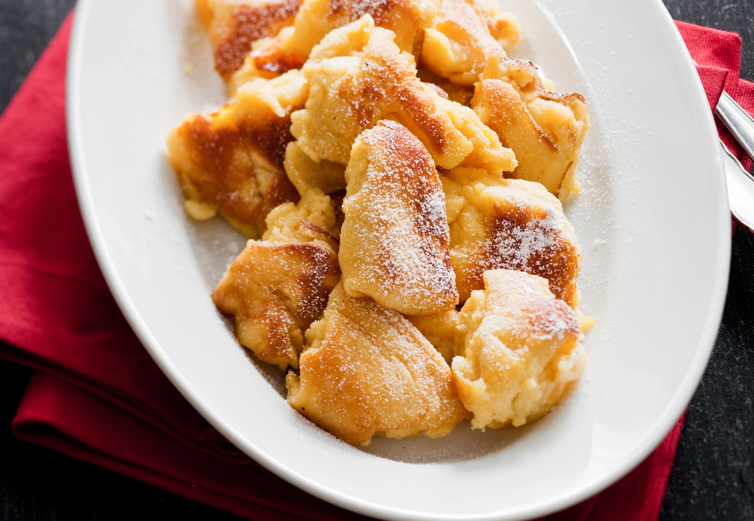 Teig halbieren und jedes Stück wenden. Schmarren auf dem Herd kurz weiterbacken, in kleine Stücke teilen, anrichten und mit Staubzucker bestreut servieren.