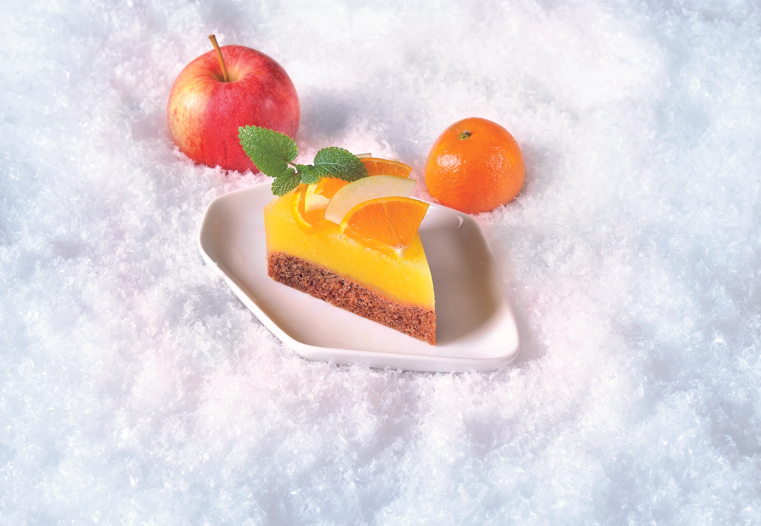 Mandarinen vierteln und in Scheiben schneiden. Apfel vierteln, Kerngehäuse entfernen, Fruchtfleisch in Scheiben schneiden. Torte in Stücke schneiden, mit den Früchten und evtl. mit Minze garnieren.